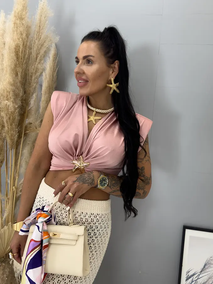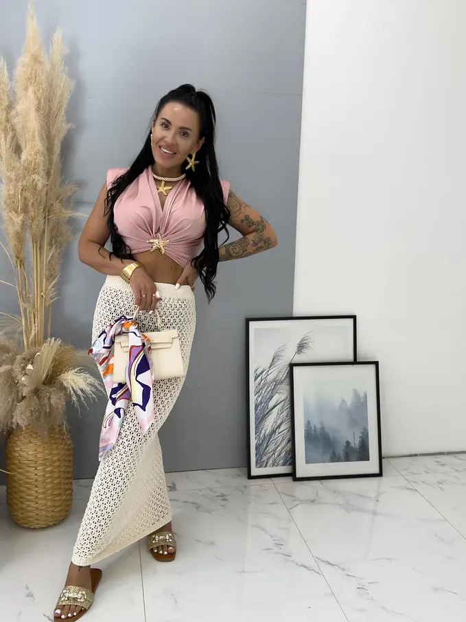 A szőke modell 164 cm magas és 57 kg. S/M méretű ruhákat visel. Méretek: 90 cm - 61 cm - 81 cm.