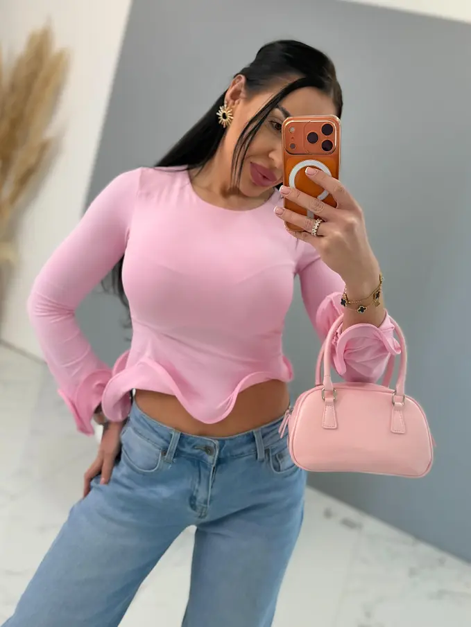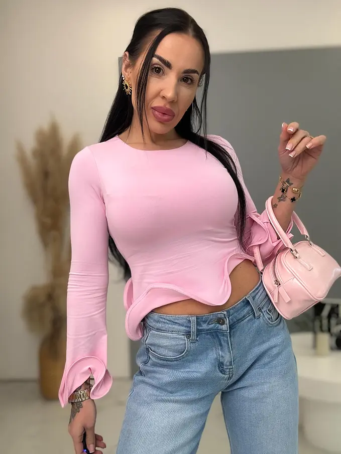 Aszimmetrikus felső, merevített fodrokkal. Igazi különleges, látványos darab, amely kiemel minden outfiitet.