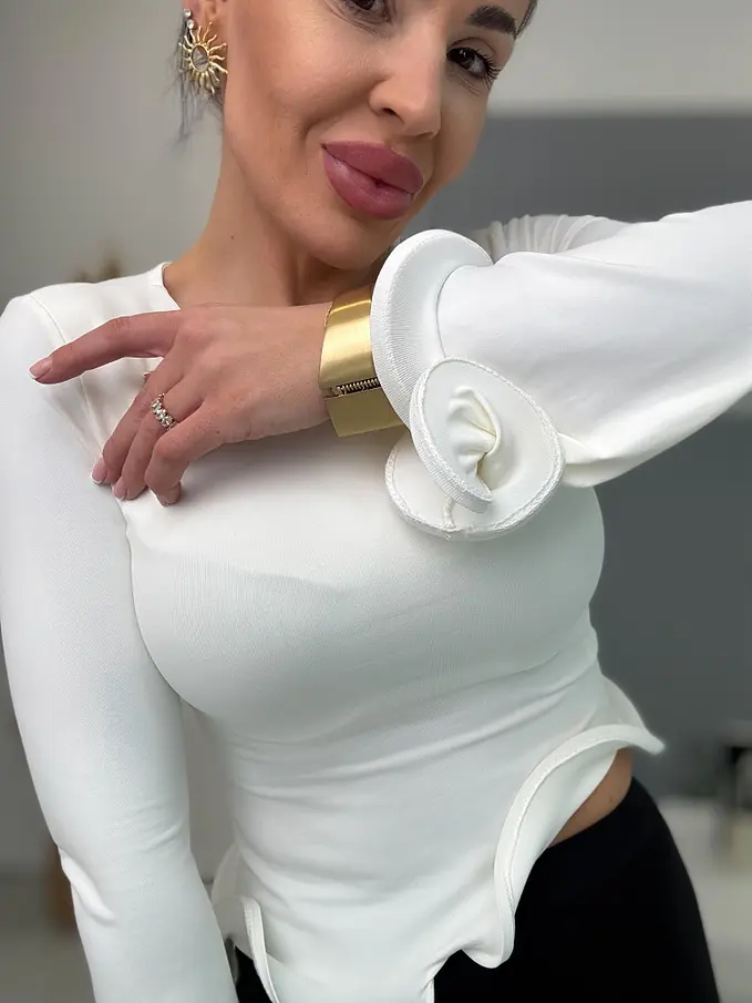 Aszimmetrikus felső, merevített fodrokkal. Igazi különleges, látványos darab, amely kiemel minden outfiitet.