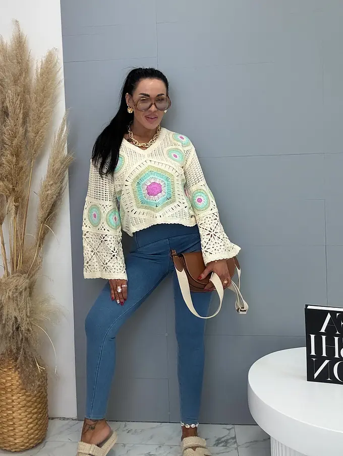 Puha pulóver V-nyakkivágással és hangsúlyos ажúros mintával. Ez a pulóver rövidebb fazonú és szélesebb ujjakkal rendelkezik.