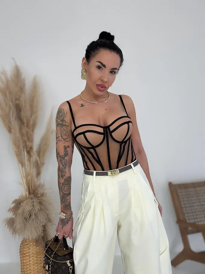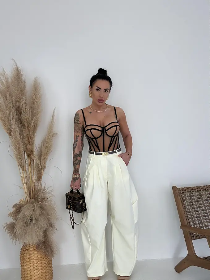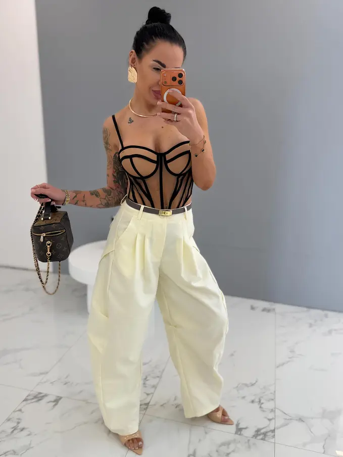 Prémium minőség. Az anyaga nem rugalmas. Ballon fazonú nadrág. Oldalsó zsebekkel. Az öv nem része a nadrágnak.