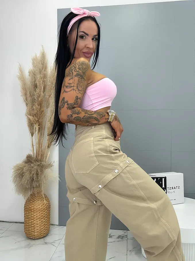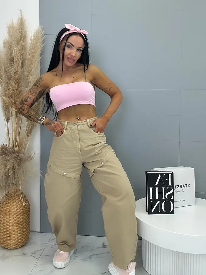 Prémium minőség. Az anyag nem elasztikus. Ballon fazonú farmer a nadrág szára kapcsokkal lecsatolható.