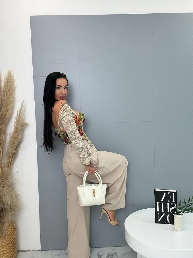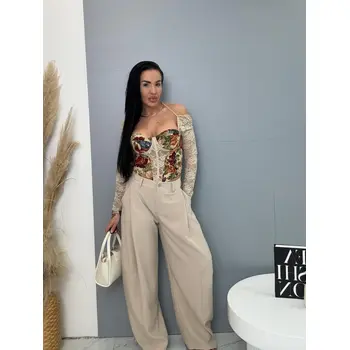 A nadrág kellemes, anyagból készült. A dereka gumis és oldalsó zsebekkel.