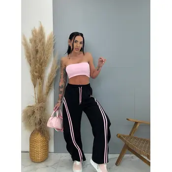 A nadrág kellemes, anyagból készült. A dereka gumis és oldalsó zsebekkel. A nadrág az alján összehúzható.