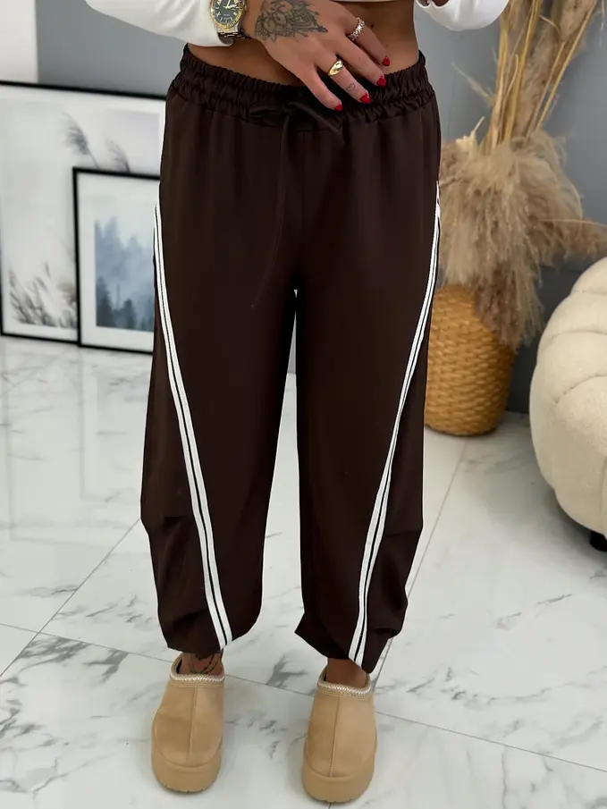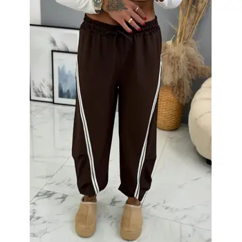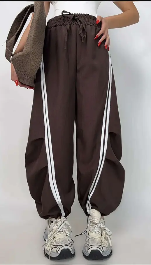 A nadrág kellemes, anyagból készült. A dereka gumis és oldalsó zsebekkel. A nadrág az alján összehúzható.