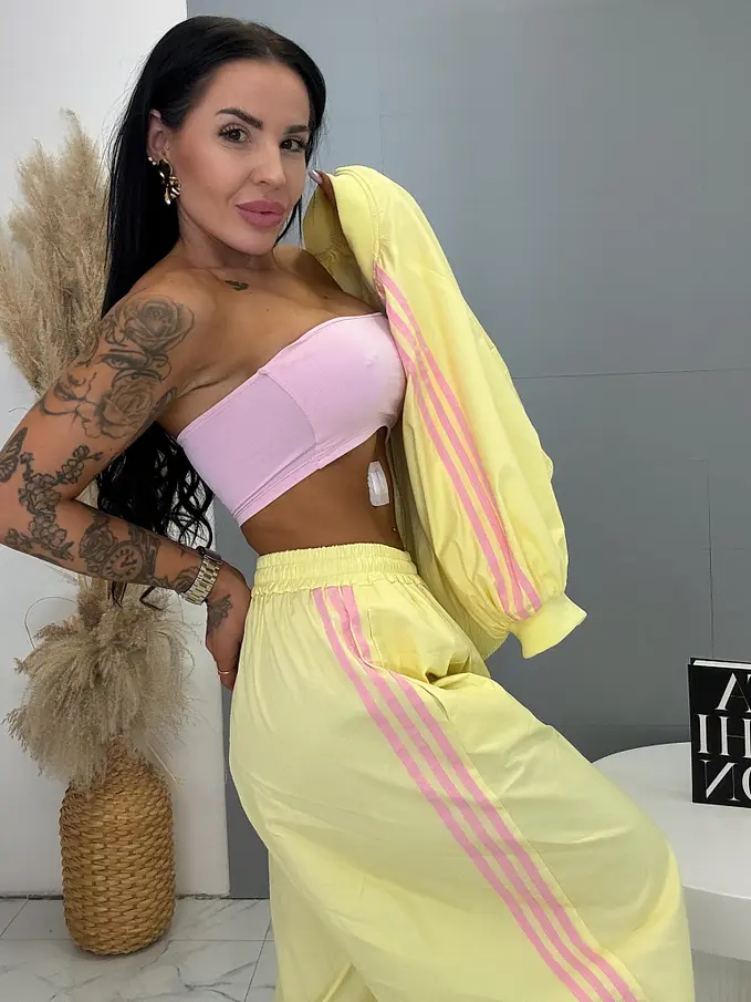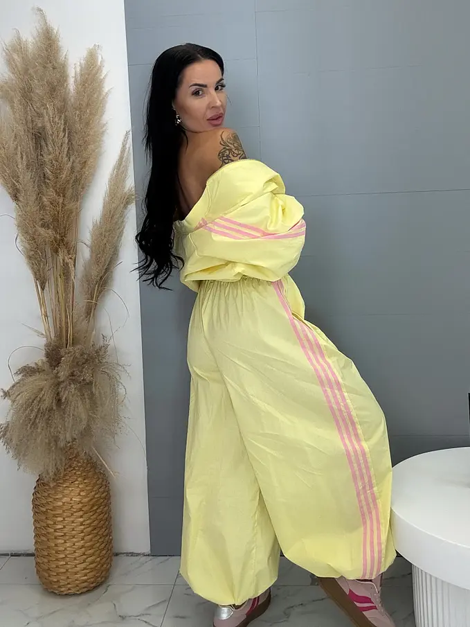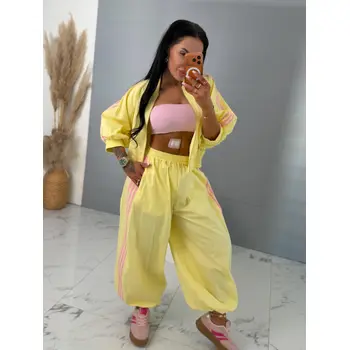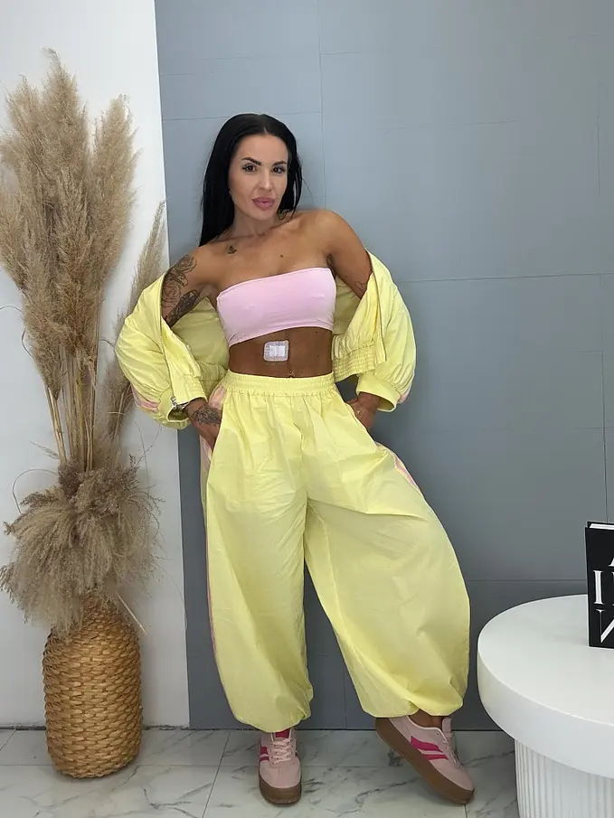 A nadrág kellemes, anyagból készült. A dereka gumis és oldalsó zsebekkel. A nadrág az alján összehúzható.