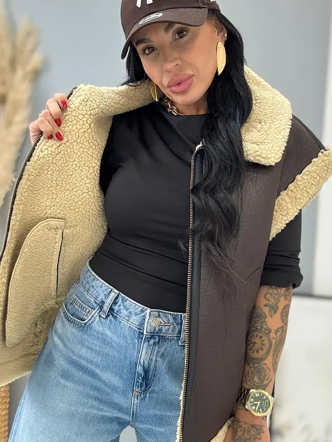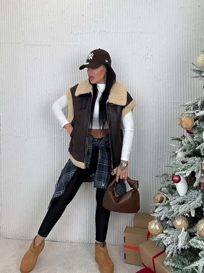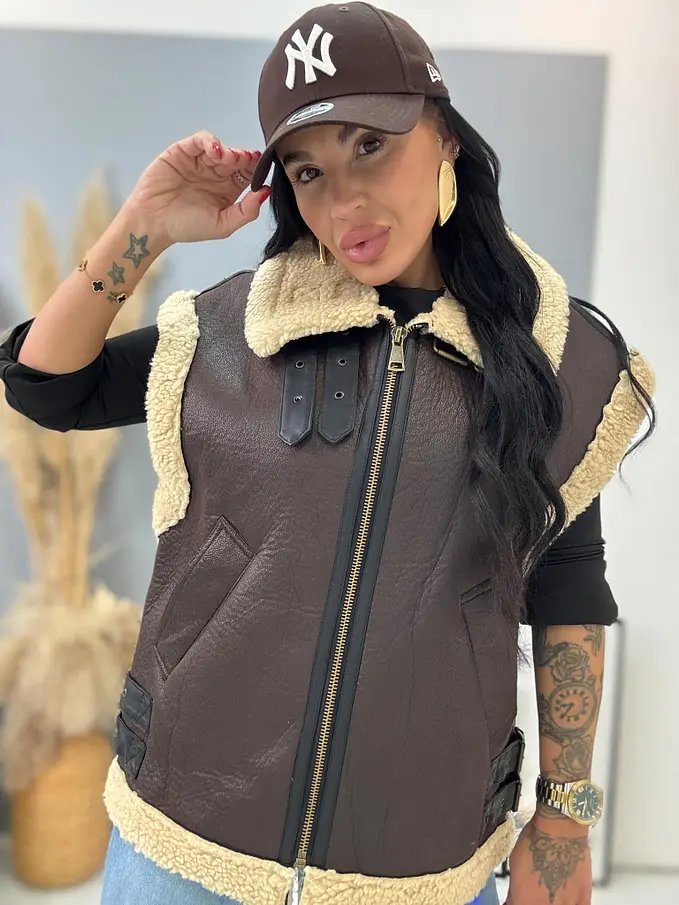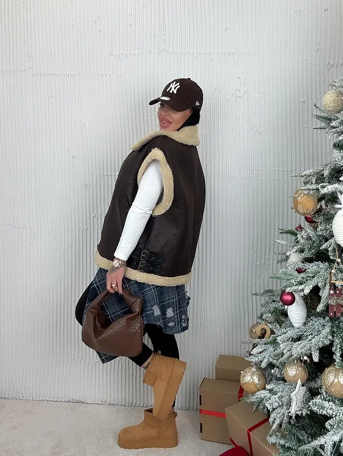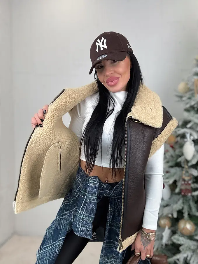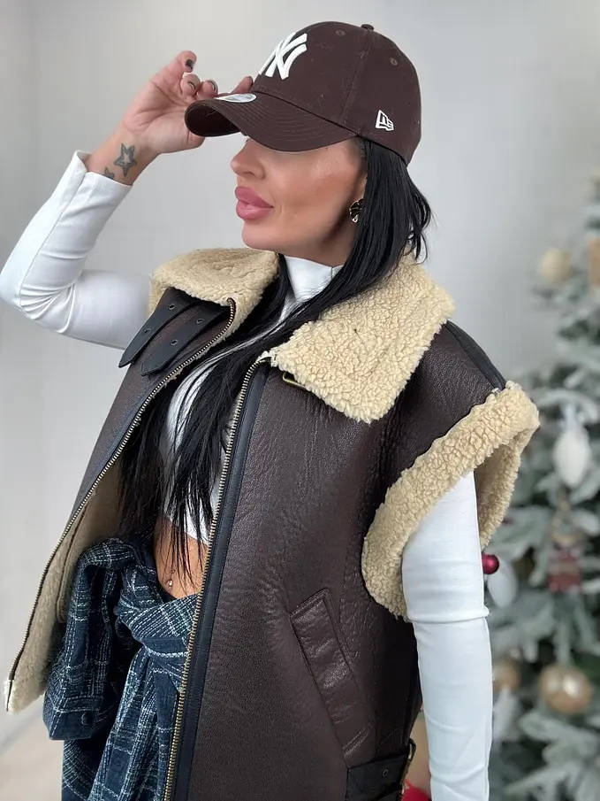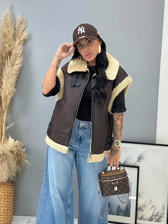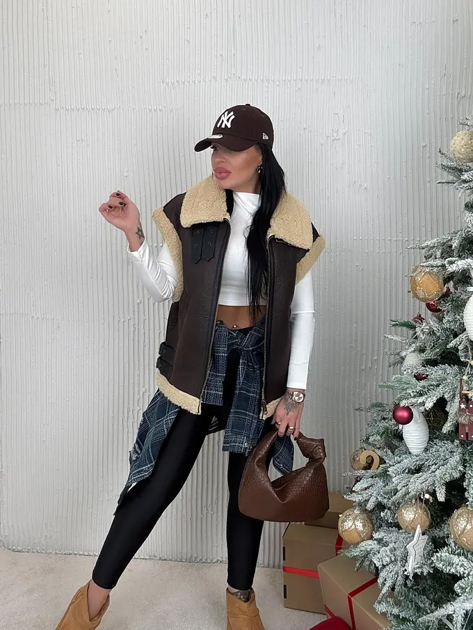 Mellény szőrmés díszítéssel. Szőrmés béléssel. A részletek arany színűek. Oldalsó zsebekkel az elején.