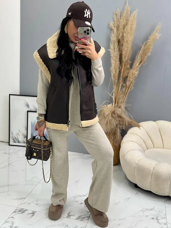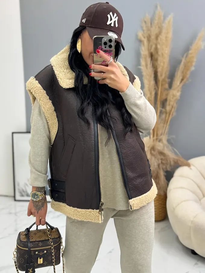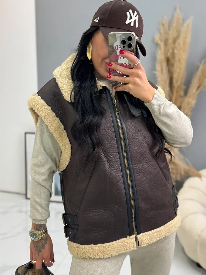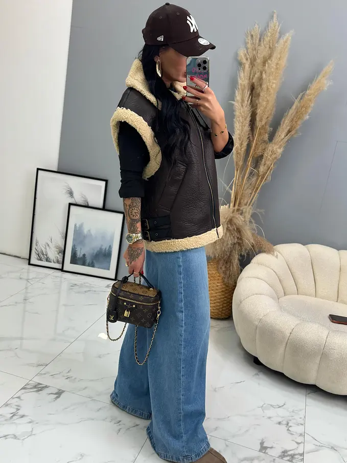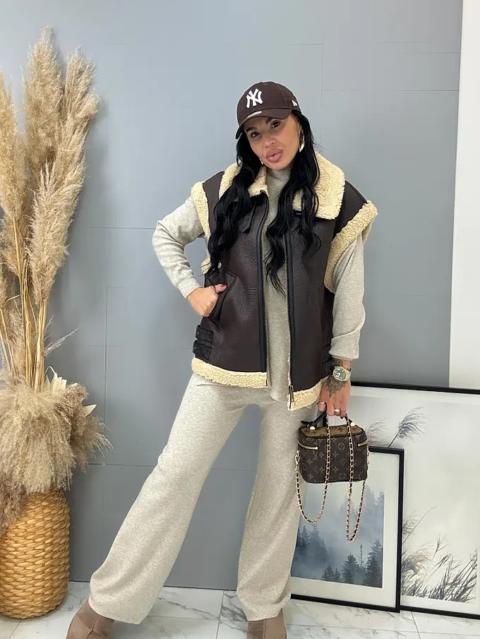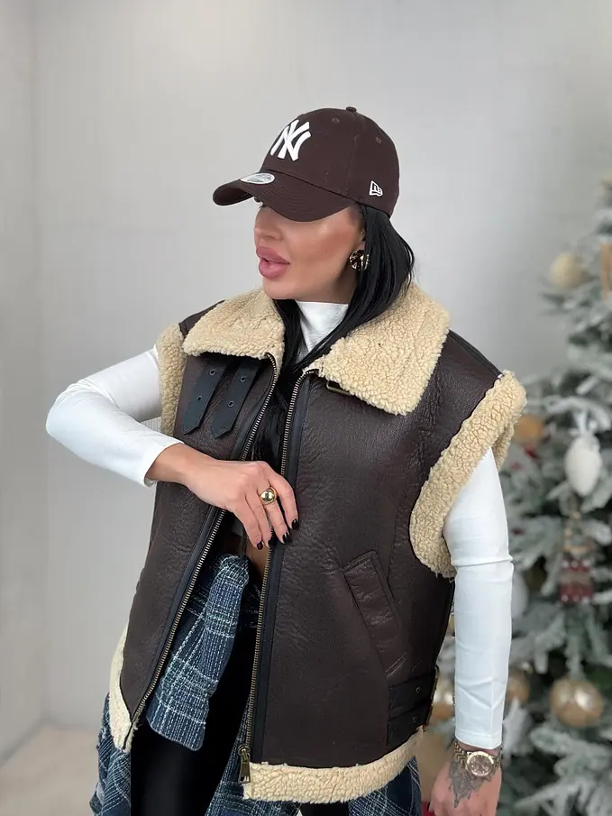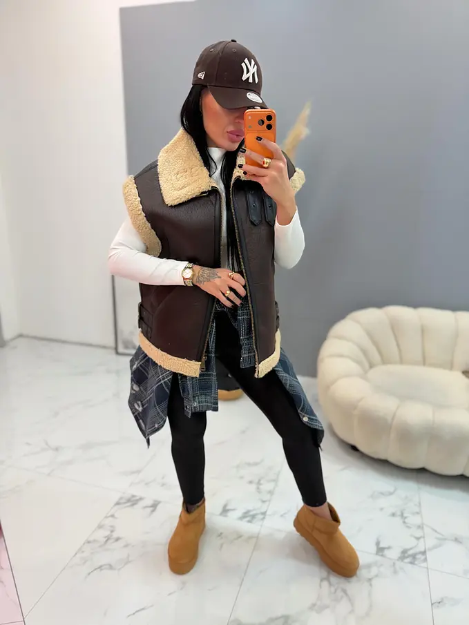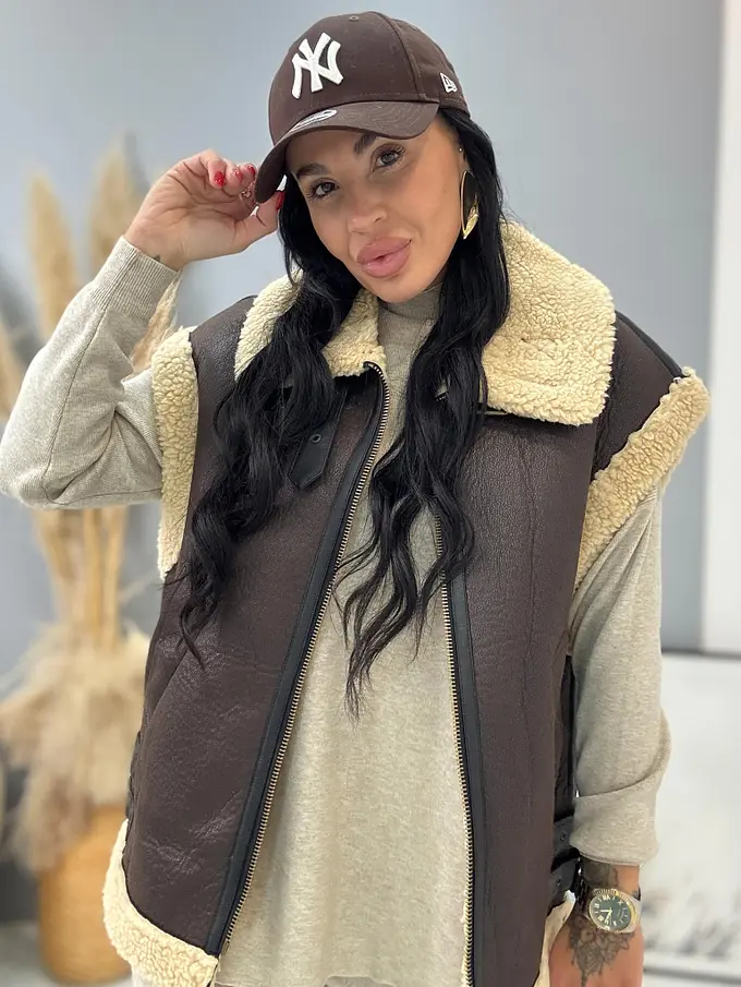 Mellény szőrmés díszítéssel. Szőrmés béléssel. A részletek arany színűek. Oldalsó zsebekkel az elején.