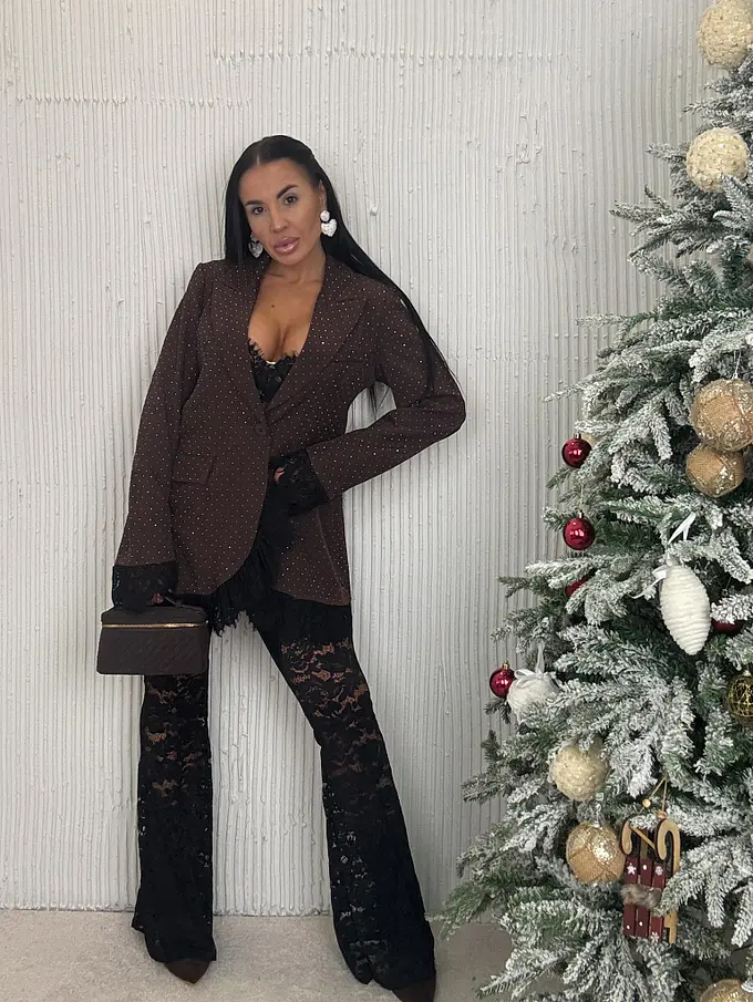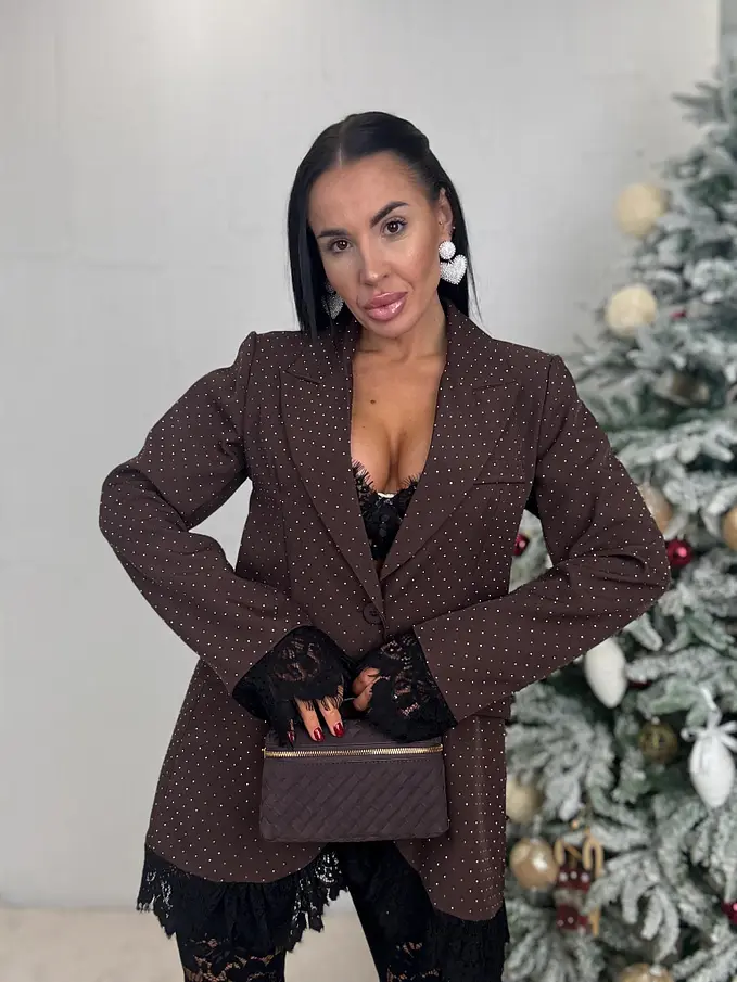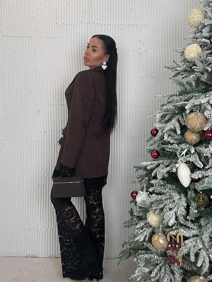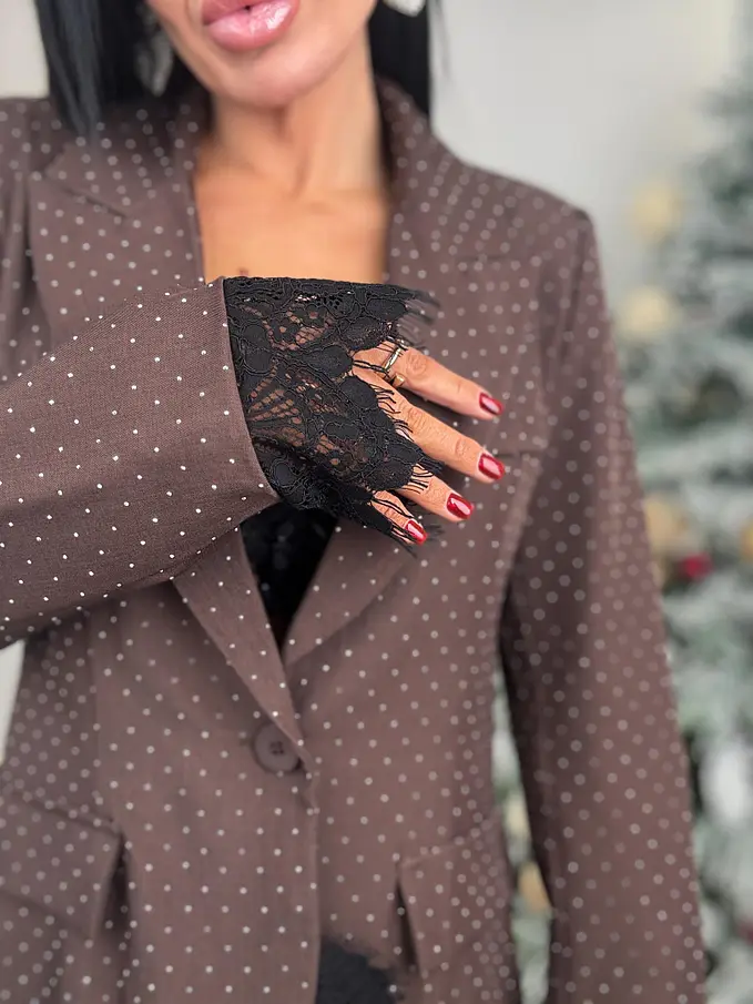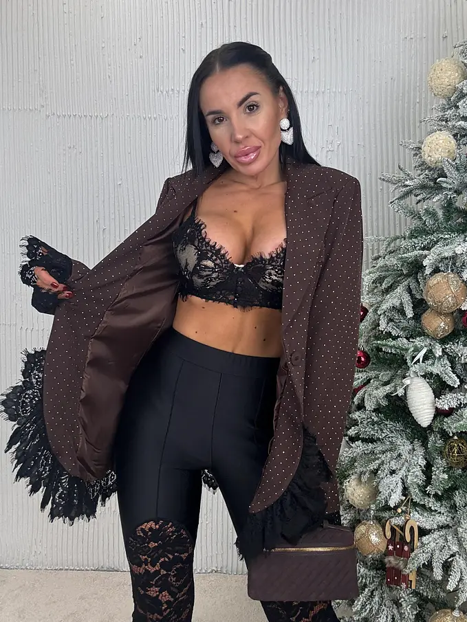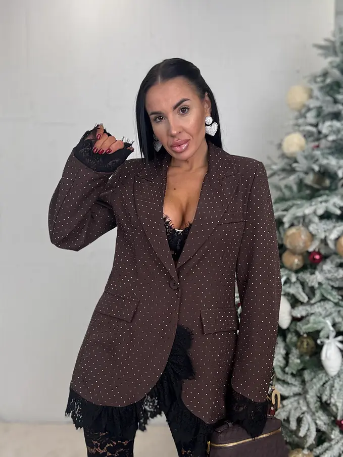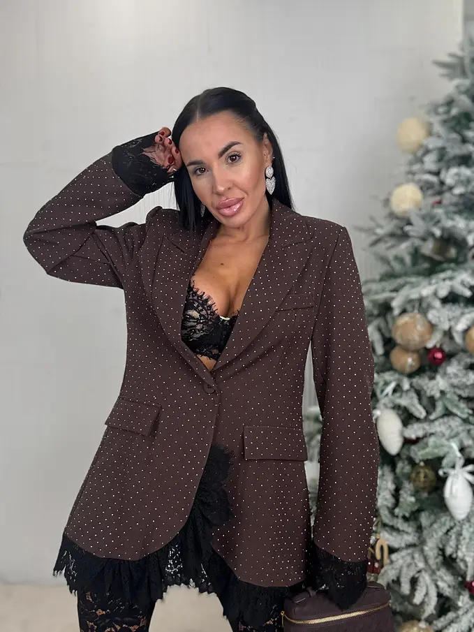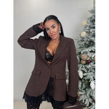 Női blézer kellemes anyagból. Az anyag nem rugalmas. A blézer gombbal záródik. Vállrésznél válltöméssel rendelkezik. Átlátszó csipkebetétekkel és kövecskékkel díszítve.
