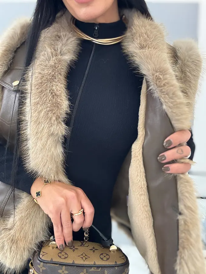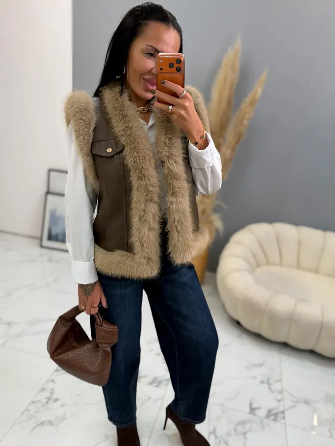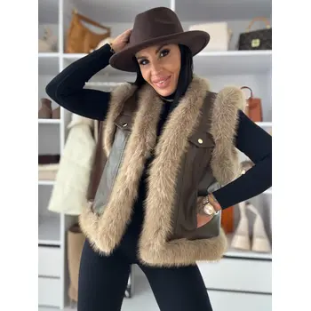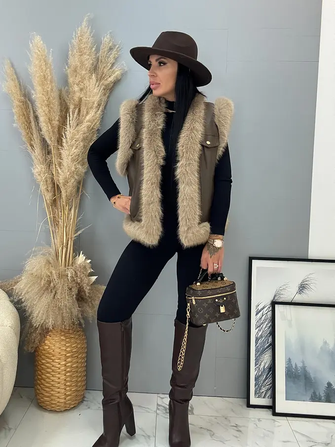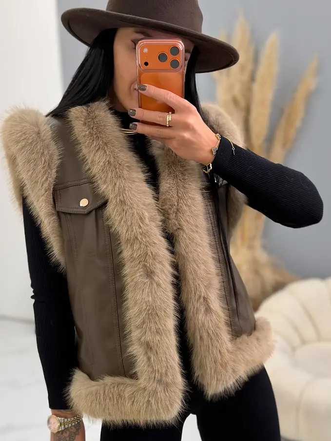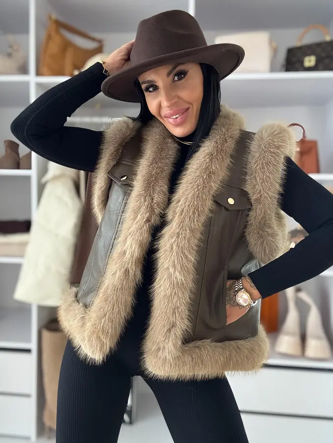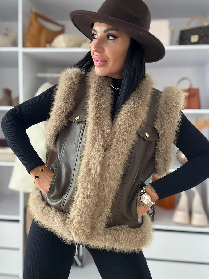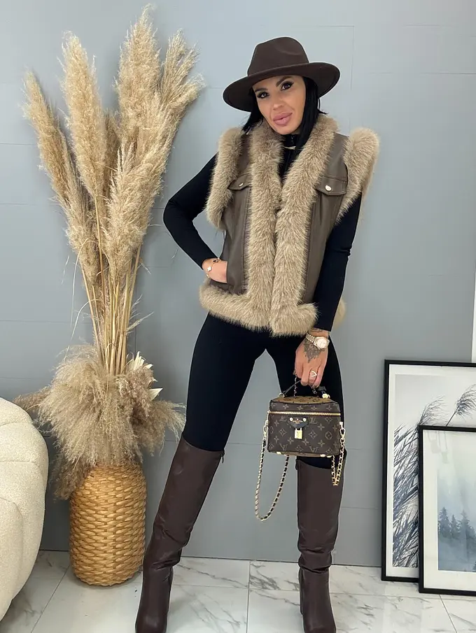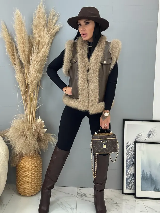 Bőrmellény szőrmés díszítéssel. Szőrmés béléssel. A részletek arany színűek. Oldalsó zsebekkel az elején. Kapcsokkal záródik.