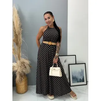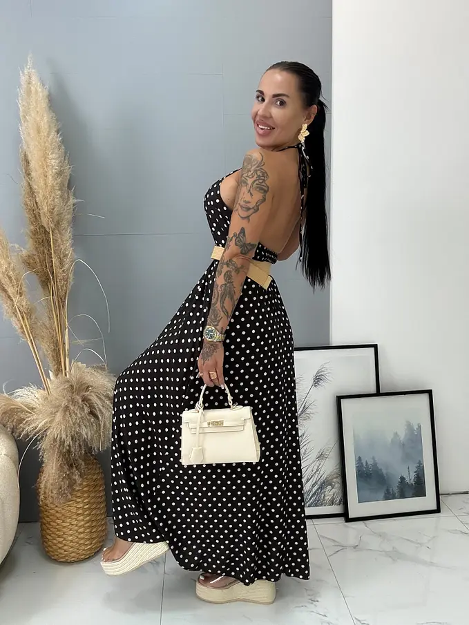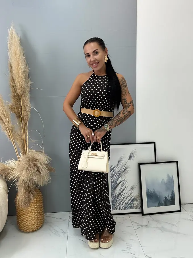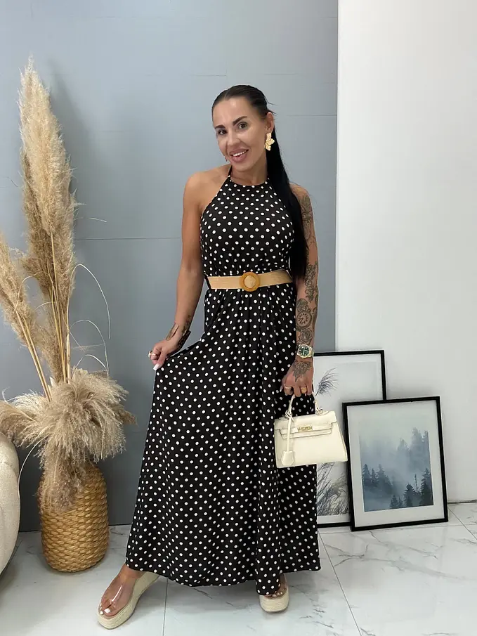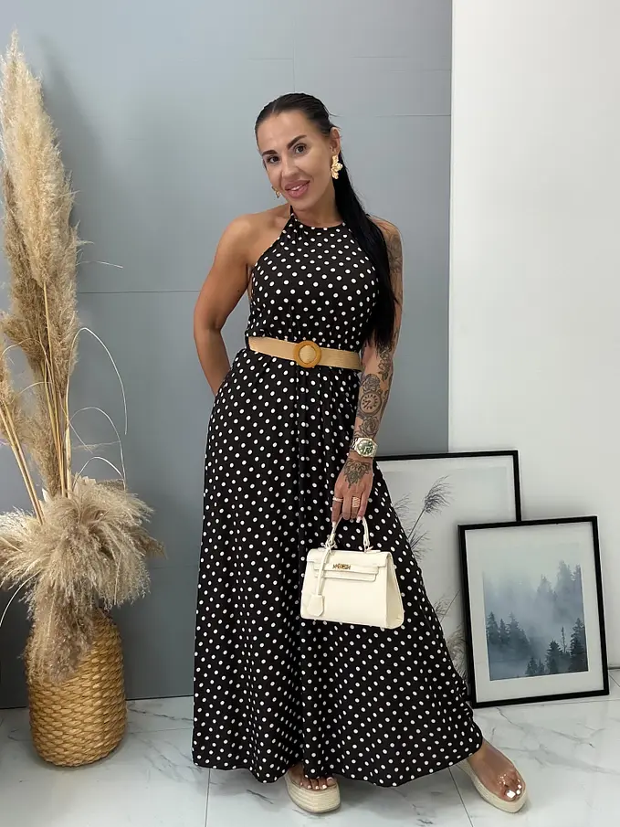 Barna pöttyös nyakba kötős ruha övvel DIARA