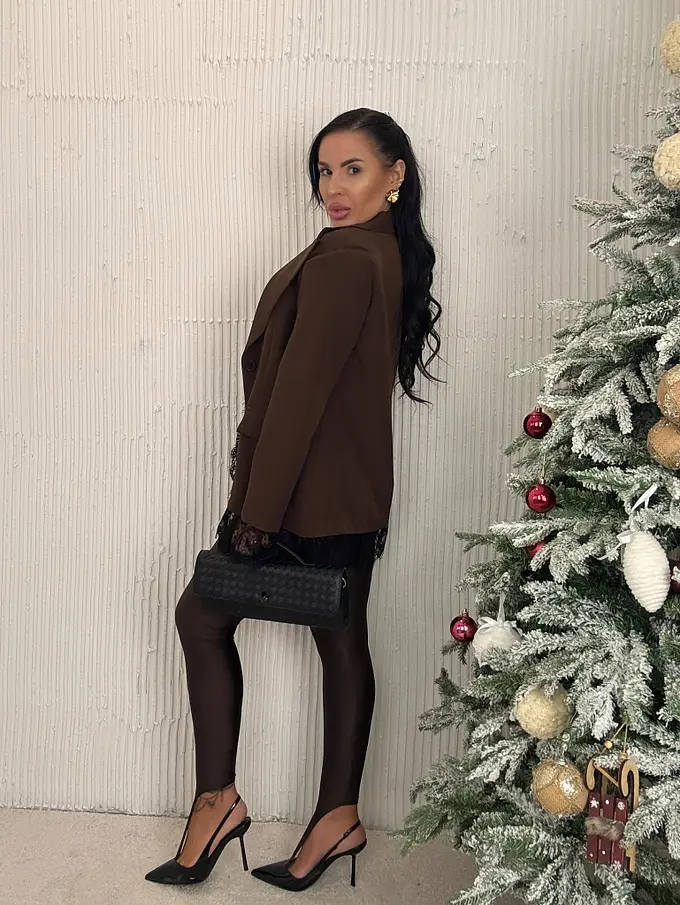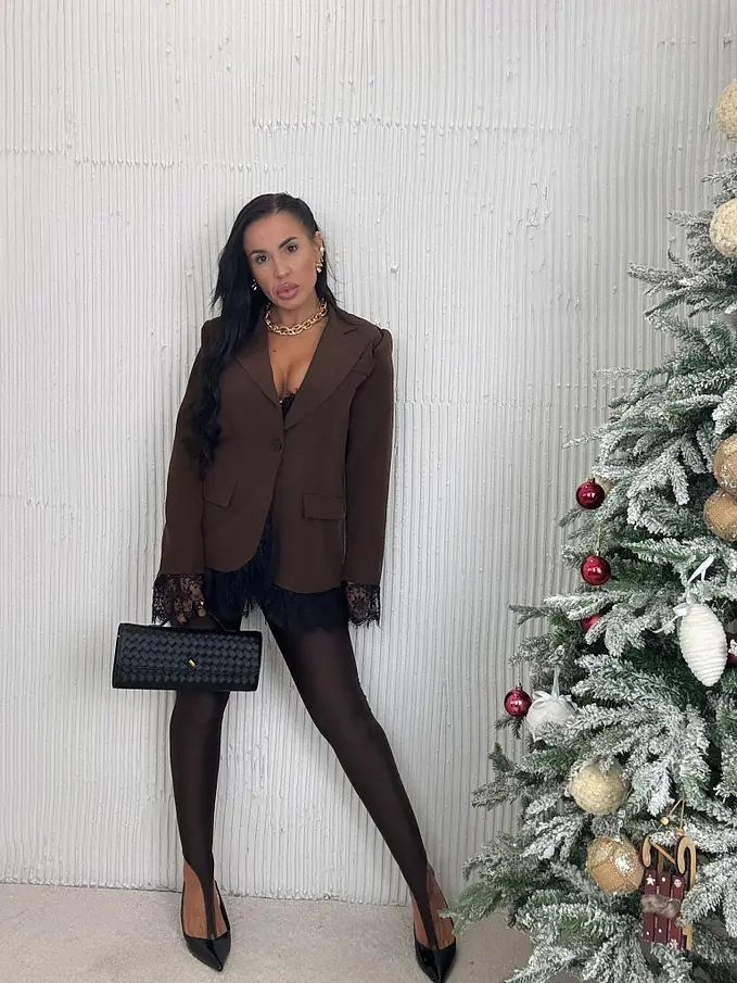 Női blézer kellemes anyagból. Az anyag nem rugalmas. A blézer gombbal záródik. Vállrésznél válltöméssel rendelkezik. Átlátszó csipkebetétekkel.