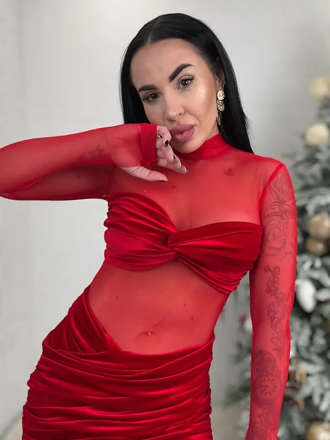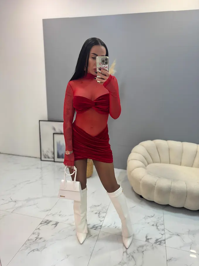 Elegáns bársony ruha sifonnal kombinálva. Anyaga enyhén elasztikus.