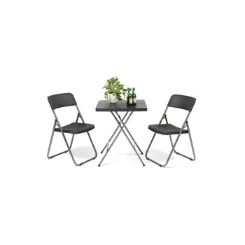 Praktikus és univerzális készlet erkélyre, teraszra vagy kertbe. Az anyag vízálló és UV sugárzásnak is ellenáll. A székek és az asztal összecsukhatóak, így tároláskor kis helyet foglalnak.