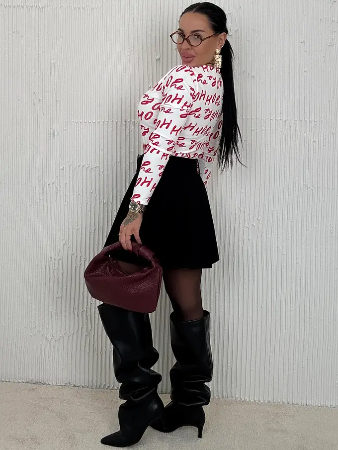 A fekete hajú modell 164 cm magas és 64 kg. M/L méretű ruhákat visel. Méretek: 99 cm - 74 cm - 93 cm.