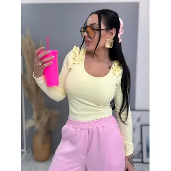A rugalmas, bordázott anyag szépen követi az alakot, míg a vállrészen elhelyezett fodor különleges, romantikus megjelenést kölcsönöz neki.