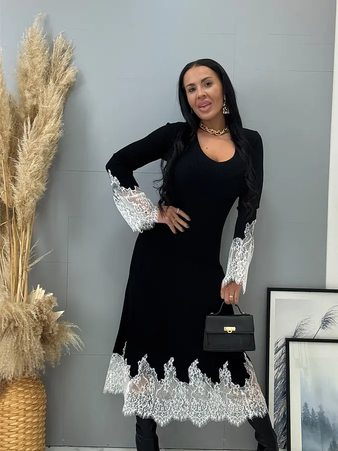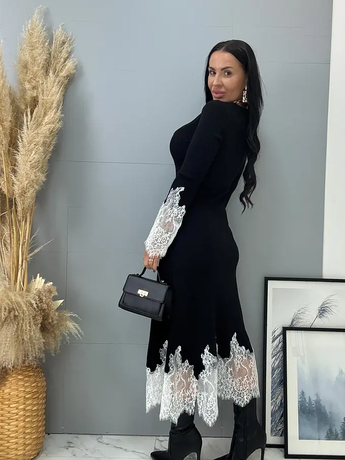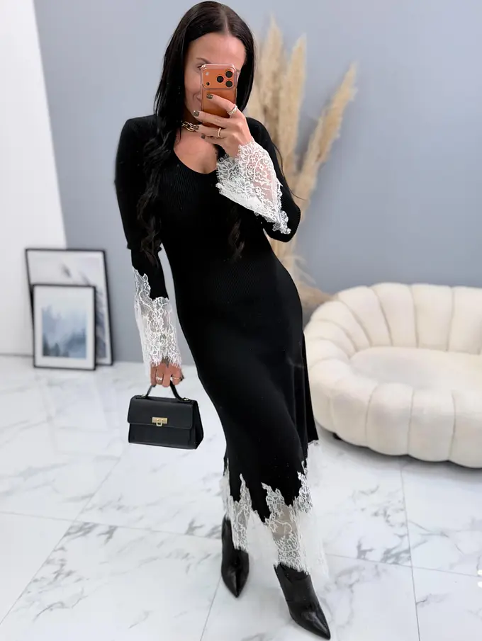 Bordázott anyagú kötött hosszú ruha csipkével DALEA