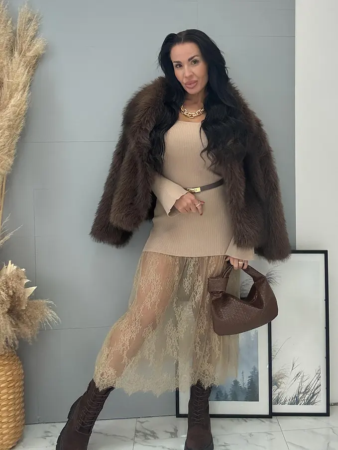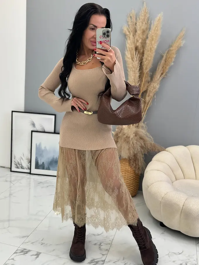 Bordázott anyagú kötött hosszú ruha csipkével DAYLIN