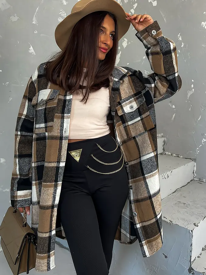 A barna hajú modell 158 cm magas és 50 kg. S méretű ruhákat visel.