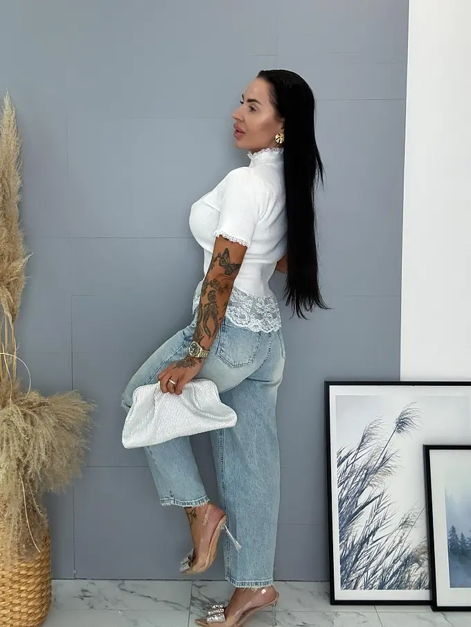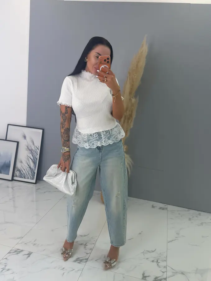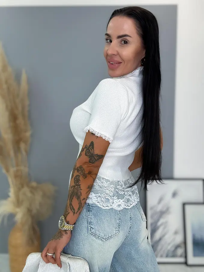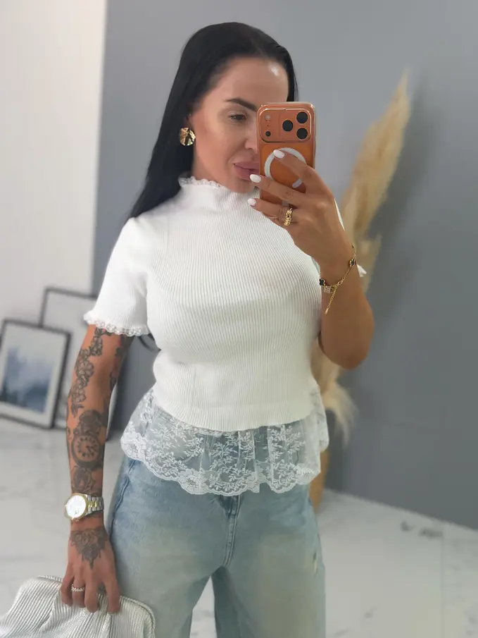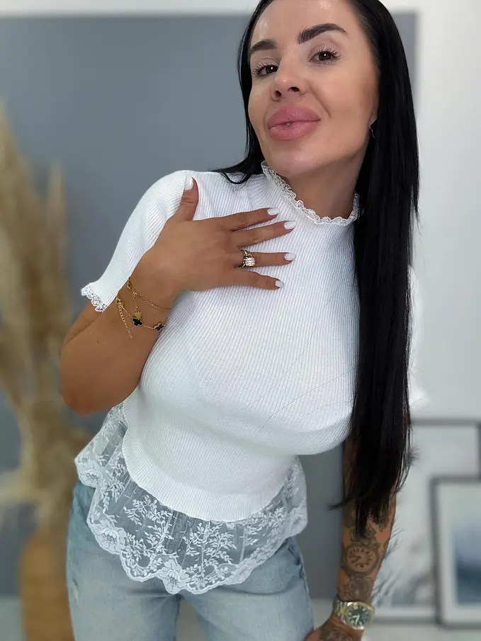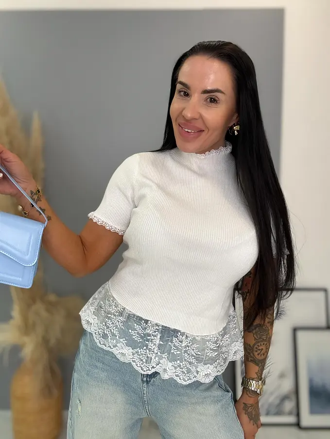 Bordázott anyagú pulóver csipkével díszítve VELETA