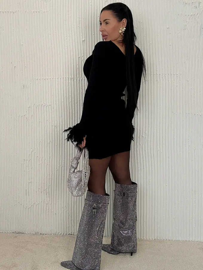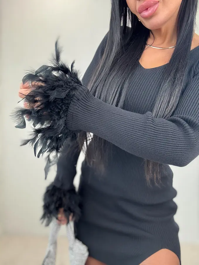 Bordázott anyagú ruha ujjain tollakkal VERA