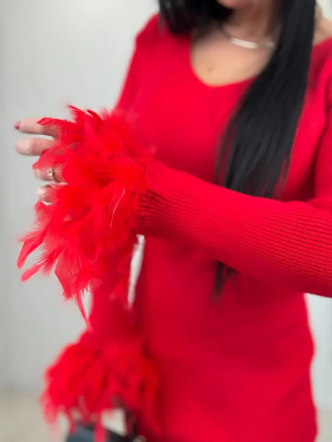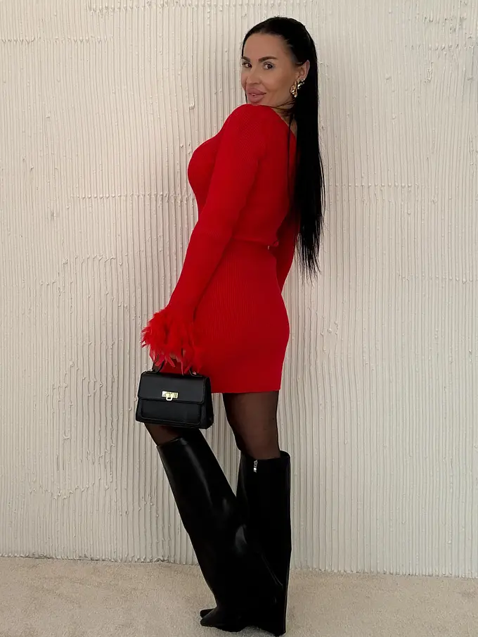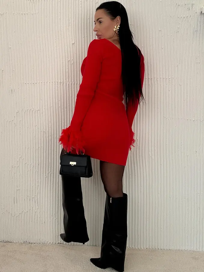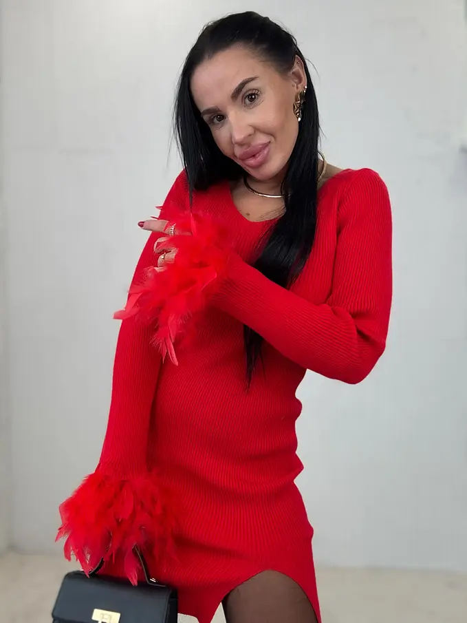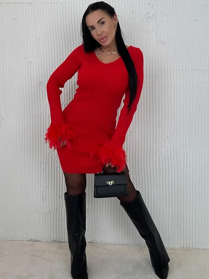 Bordázott anyagú ruha ujjain tollakkal VERA