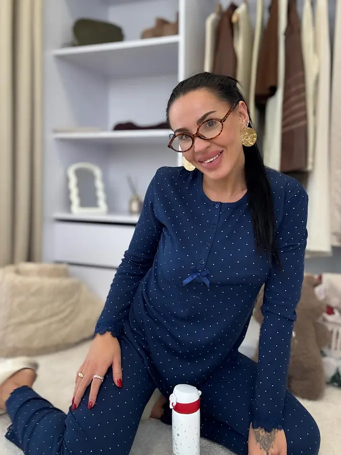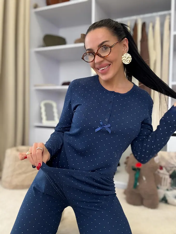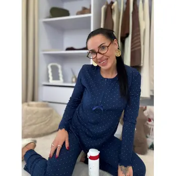 Bordázott pizsama csipkeszegéllyel. Anyaga vékony. A nadrág gumis derekú. Felső rész gomboláspánttal.