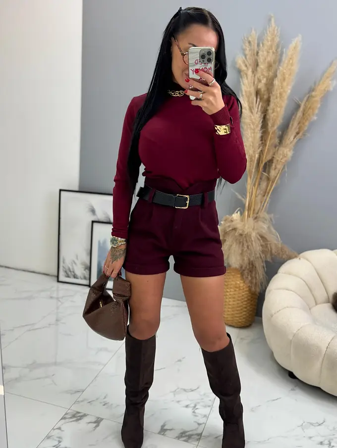 Alakot kiemelő fazonú sort, övvel. Enyhén elasztikus, kellemesen meleg anyagból készült.