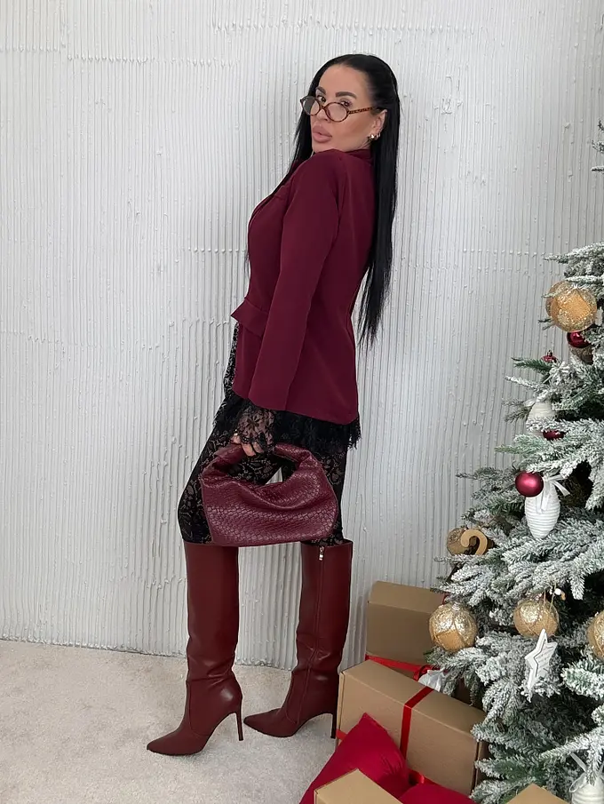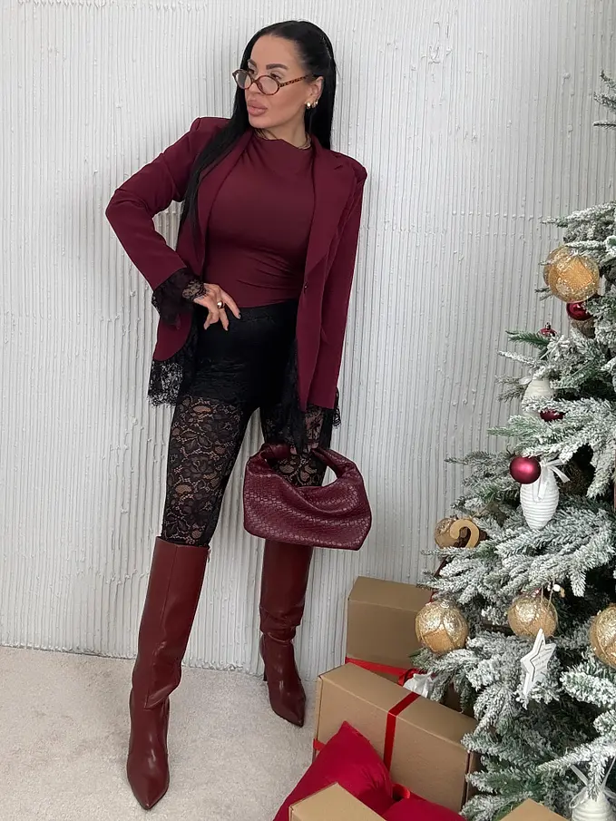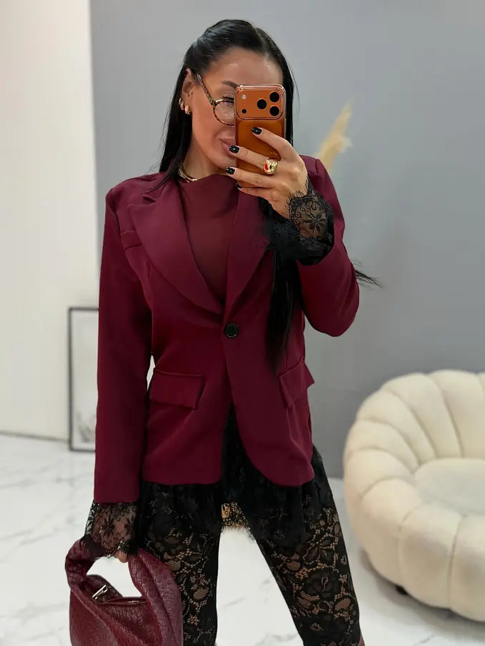 Női blézer kellemes anyagból. Az anyag nem rugalmas. A blézer gombbal záródik. Vállrésznél válltöméssel rendelkezik. Átlátszó csipkebetétekkel.