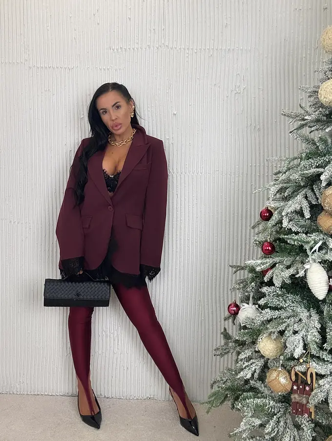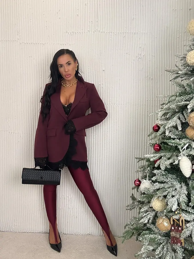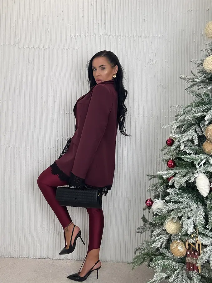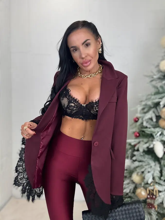 Női blézer kellemes anyagból. Az anyag nem rugalmas. A blézer gombbal záródik. Vállrésznél válltöméssel rendelkezik. Átlátszó csipkebetétekkel.