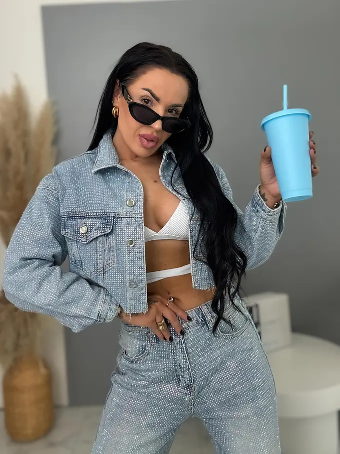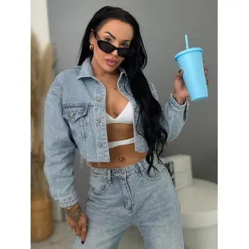 Crop denim kabát strasszkövekkel RAINBOW DIAMOND