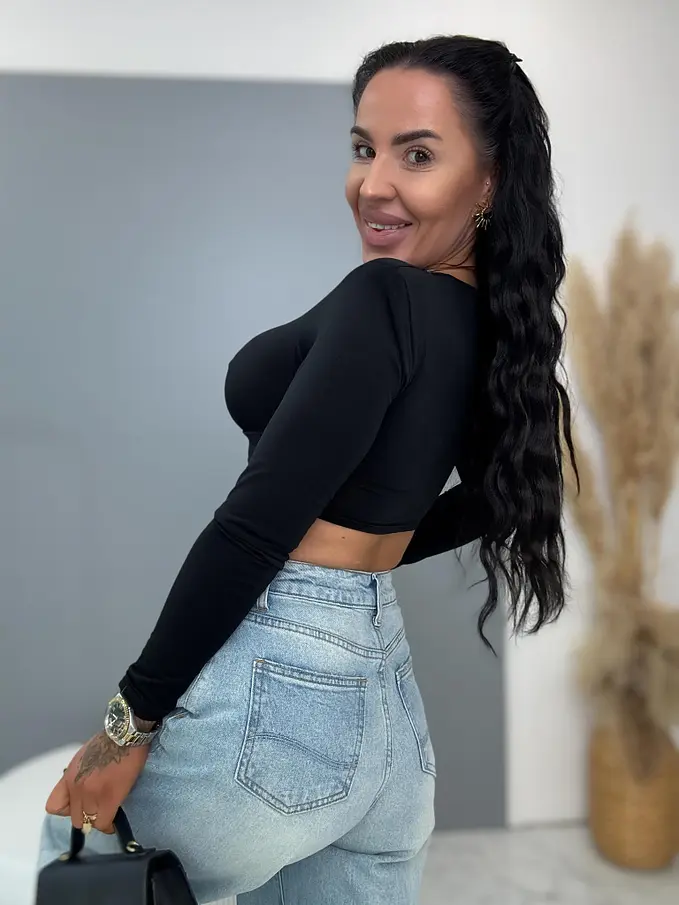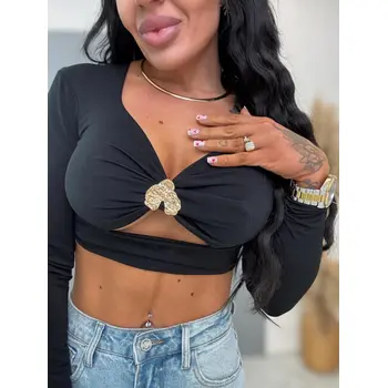 Crop-top, mely tökéletes választás bármilyen eseményre. Anyaga elasztikus. A dísz arany színű.
