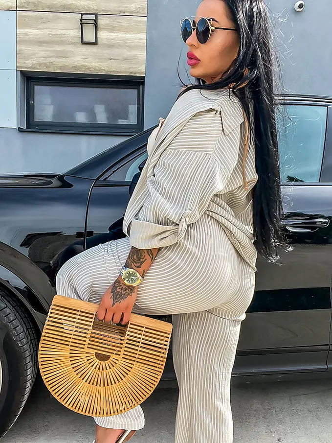 Női elegáns együttes a legújabb kollekcióból. Ingből és gumis derekú nadrágból áll. Anyaga kellemes, nem elasztikus.