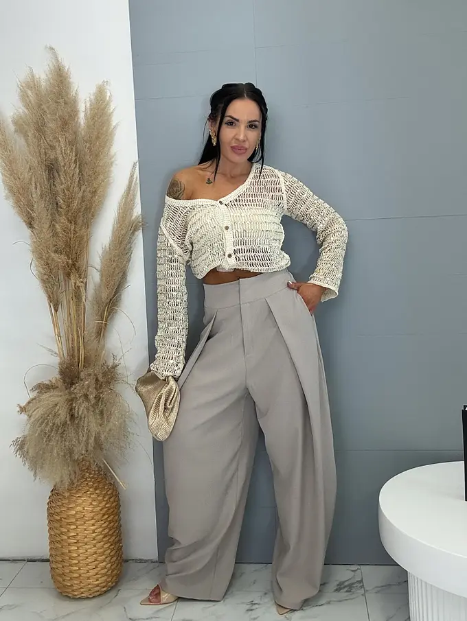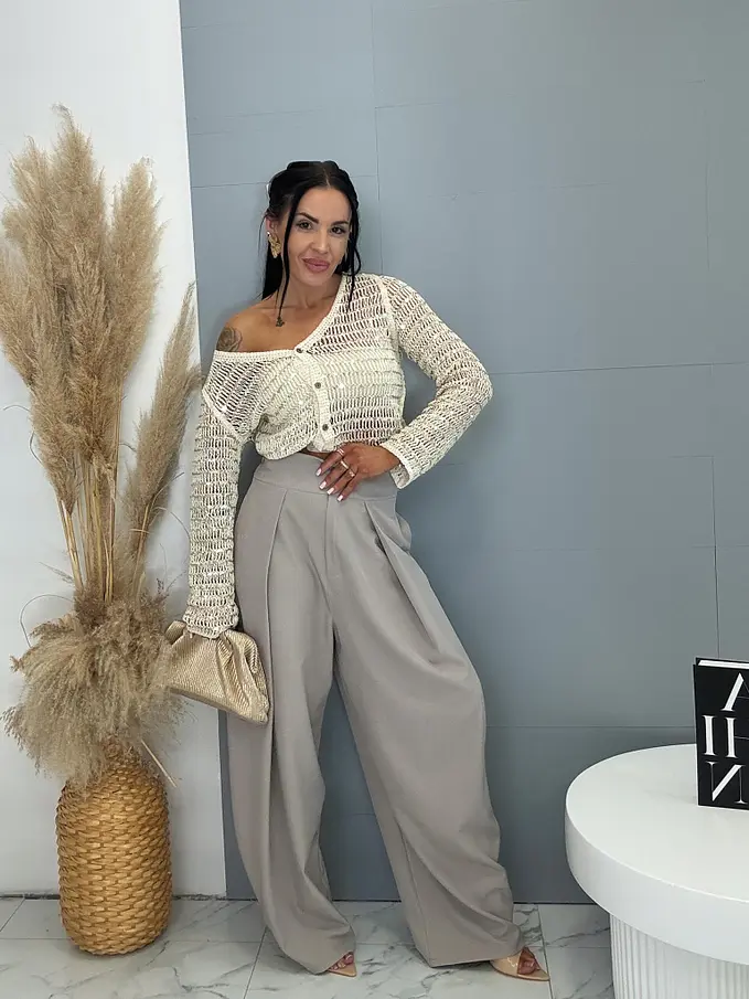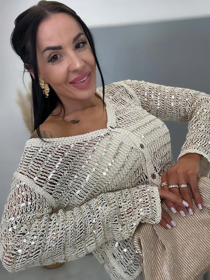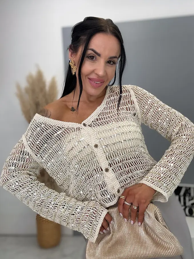 Kardigán kellemes anyagból. Horgolt, flitterekkel, rugalmas anyag.