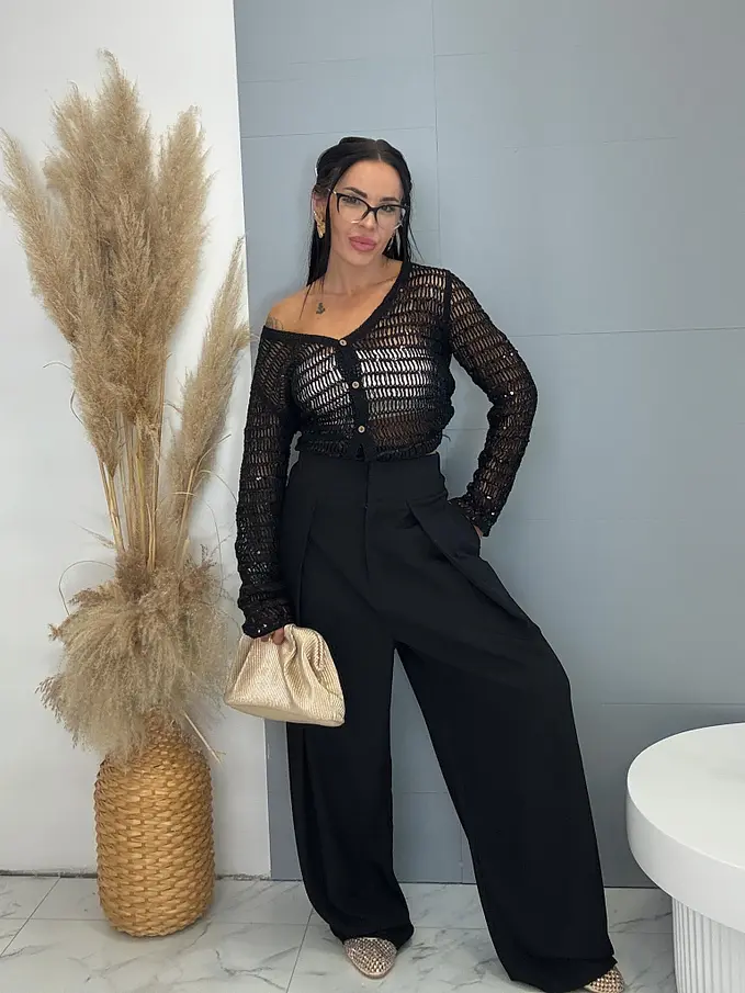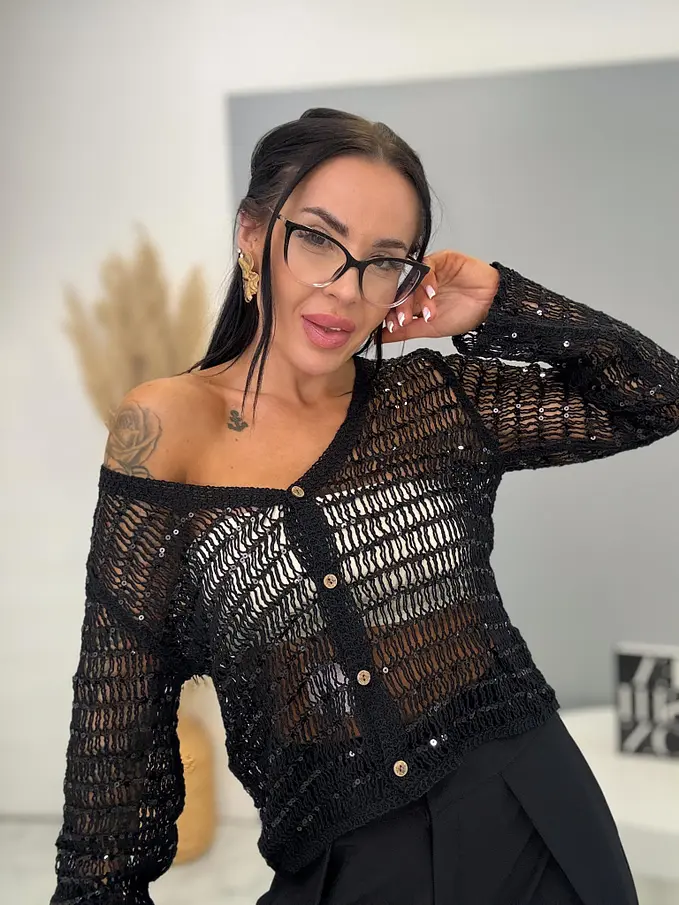Kardigán kellemes anyagból. Horgolt, flitterekkel, rugalmas anyag.