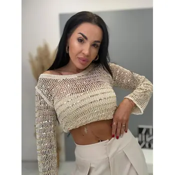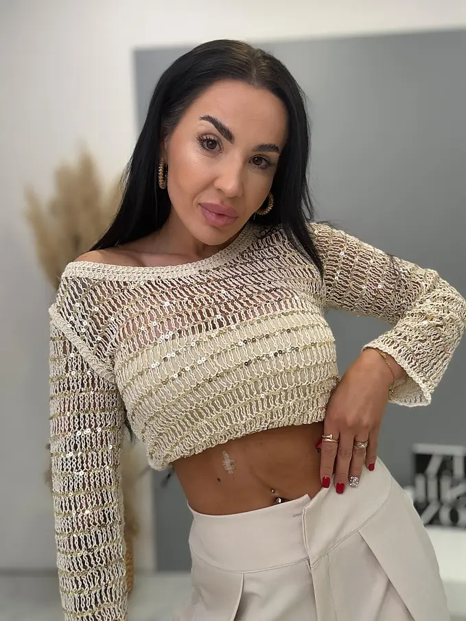 Pulóver kellemes anyagból, horgolt top flitterekkel, enyhén rugalmas anyag.