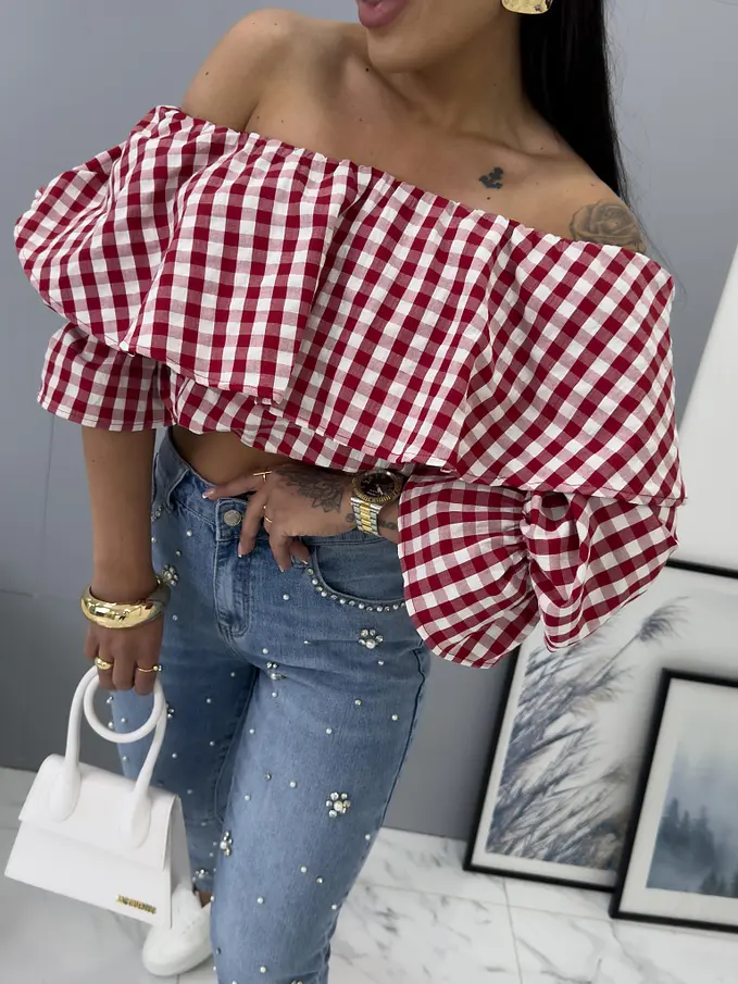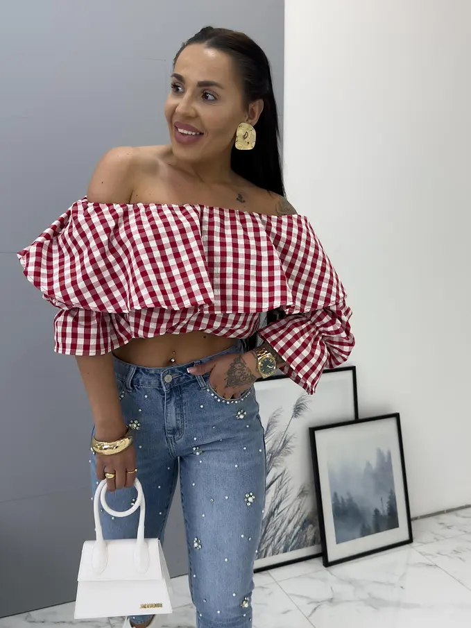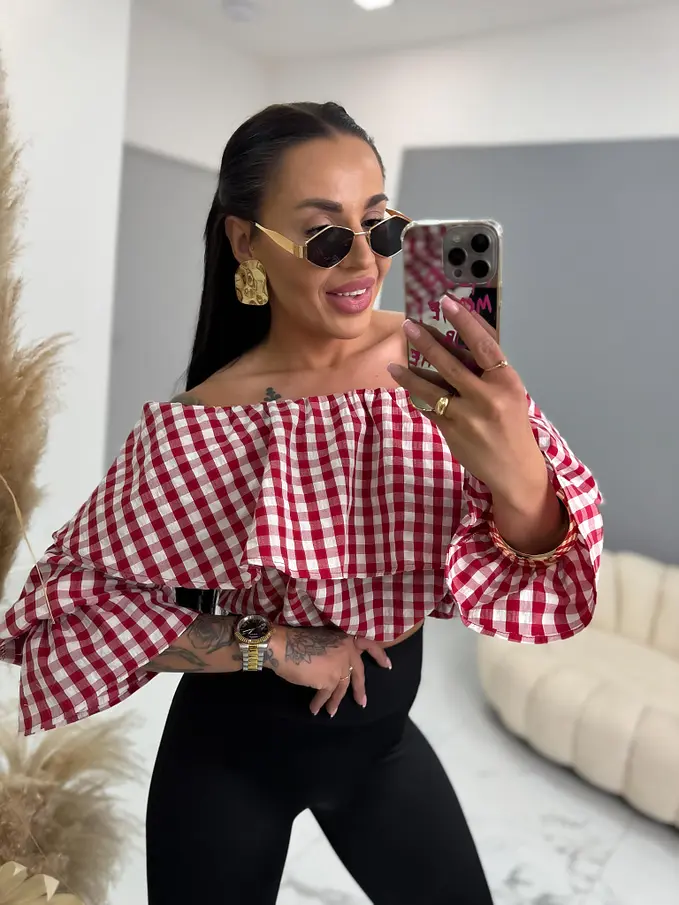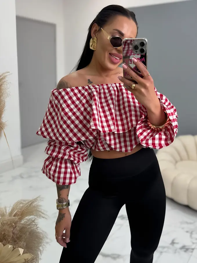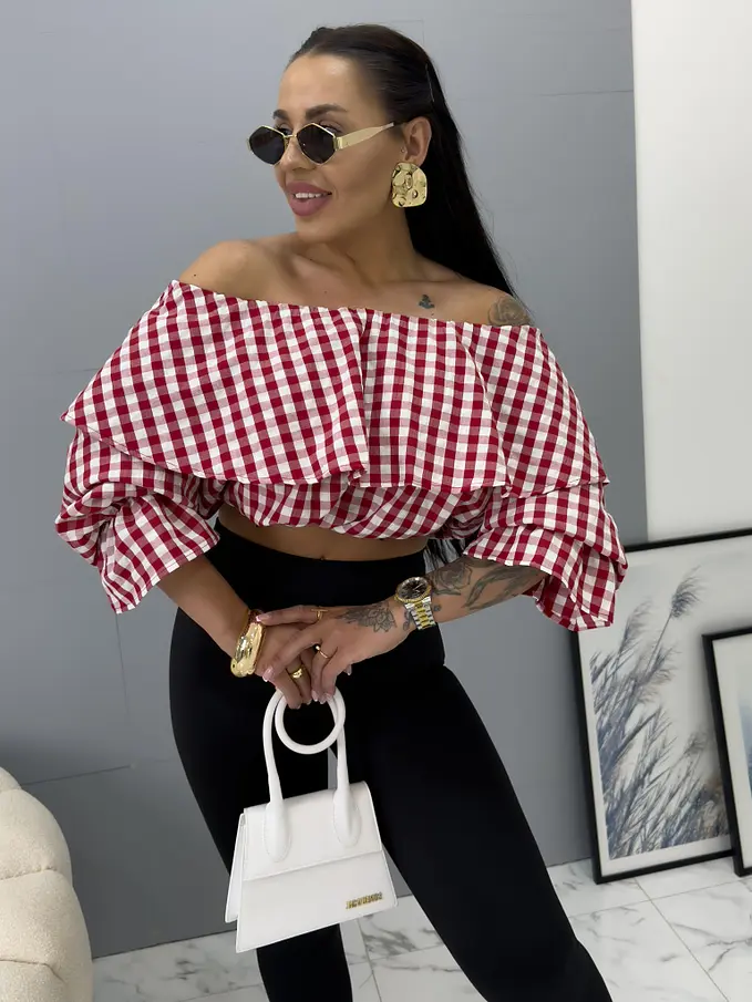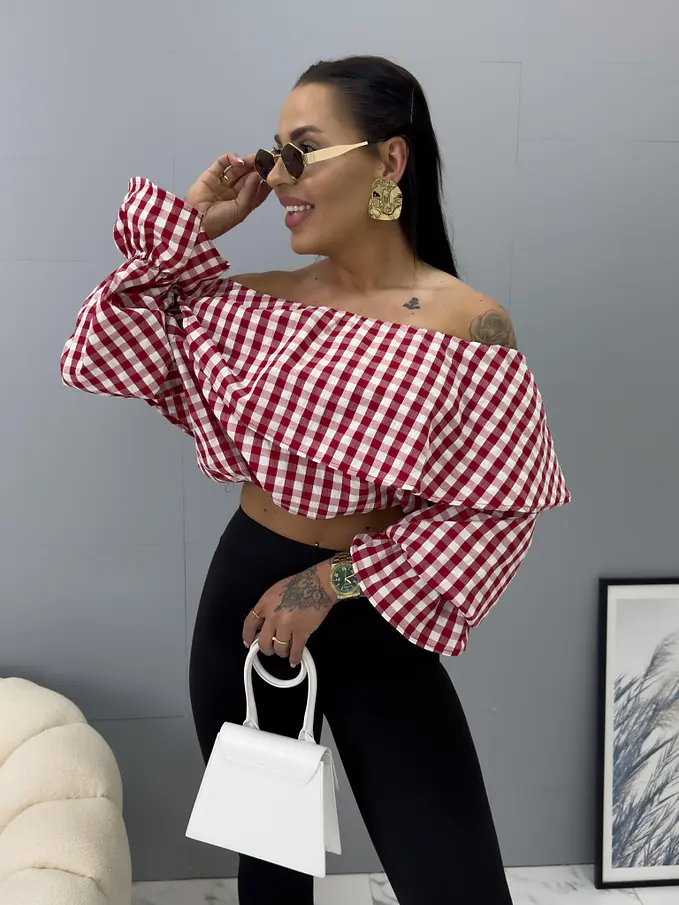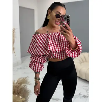 Trendi blúz kellemes anyagból. Vállán és ujjai végén gumival.
