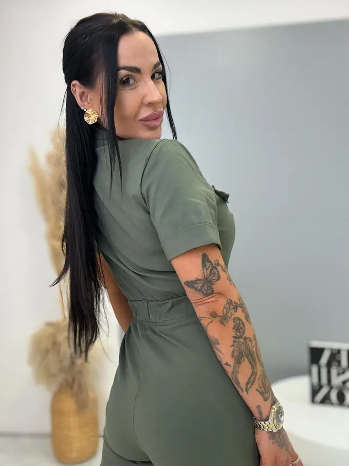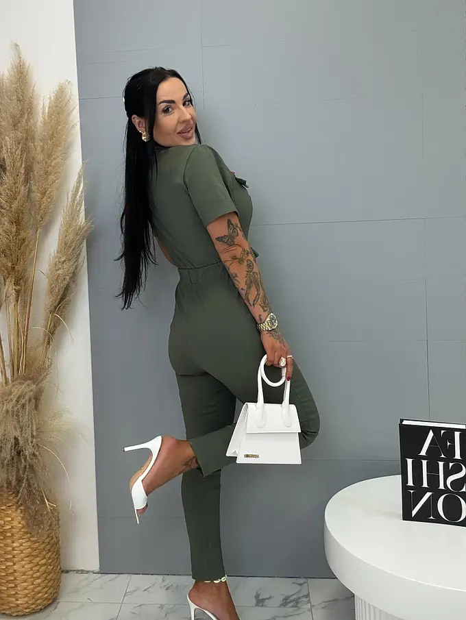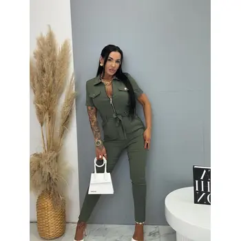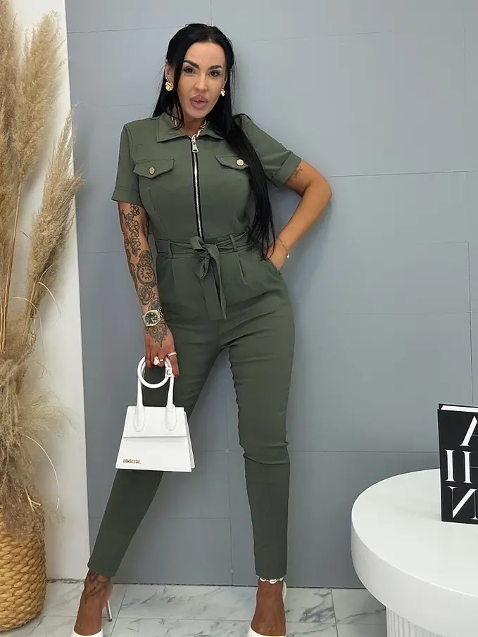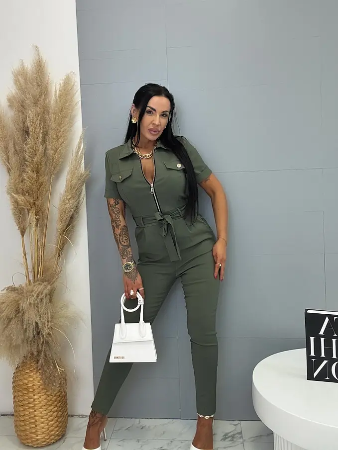A rövid ujjú, galléros overál stílusos és praktikus darab minden ruhatárba. Extra elasztikus anyagból készült, így maximális kényelmet és szabad mozgást biztosít. Cipzáras kialakítása megkönnyíti az öltözködést, miközben modern megjelenést kölcsönöz. A modellt öv egészíti ki, amely kiemeli a derekat és előnyös sziluettet formál. oldalsó zsebekkel, ami növeli a praktikumot és a kényelmet. Az overál ideális választás mindennapi viseletre és szabadidős tevékenységekhez is.