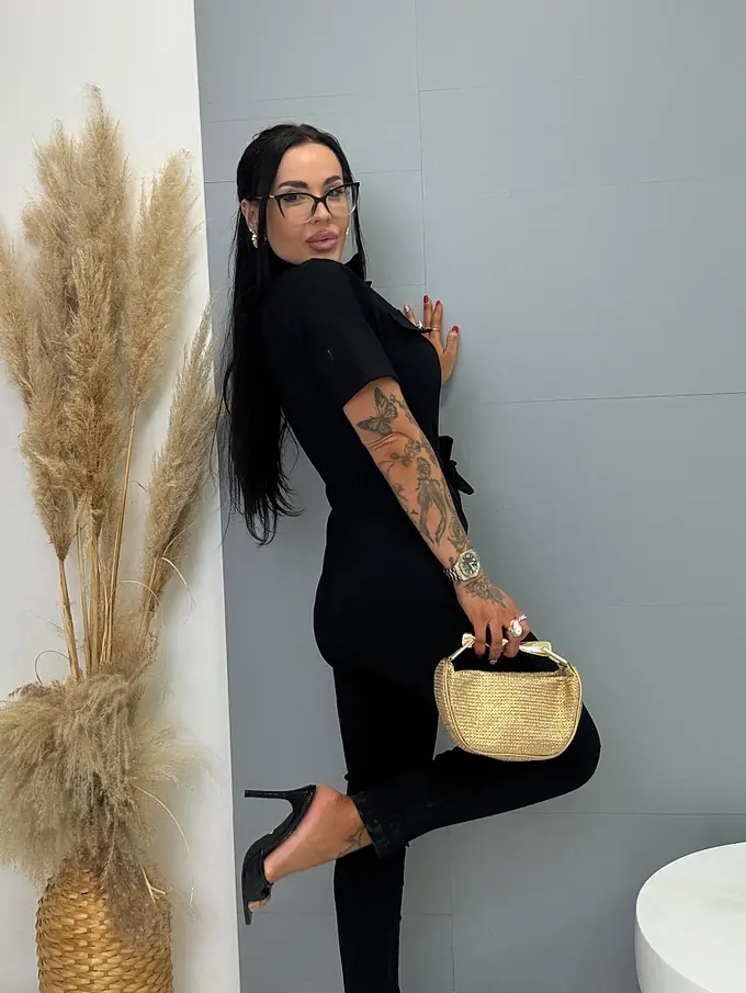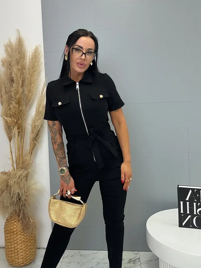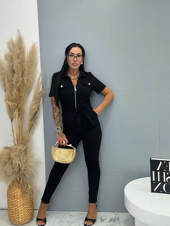 A rövid ujjú, galléros overál stílusos és praktikus darab minden ruhatárba. Extra elasztikus anyagból készült, így maximális kényelmet és szabad mozgást biztosít. Cipzáras kialakítása megkönnyíti az öltözködést, miközben modern megjelenést kölcsönöz. A modellt öv egészíti ki, amely kiemeli a derekat és előnyös sziluettet formál. oldalsó zsebekkel, ami növeli a praktikumot és a kényelmet. Az overál ideális választás mindennapi viseletre és szabadidős tevékenységekhez is.