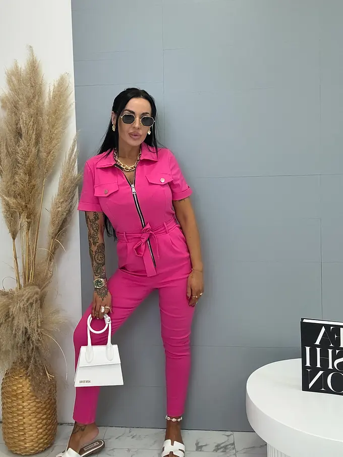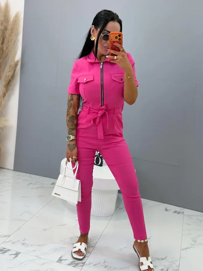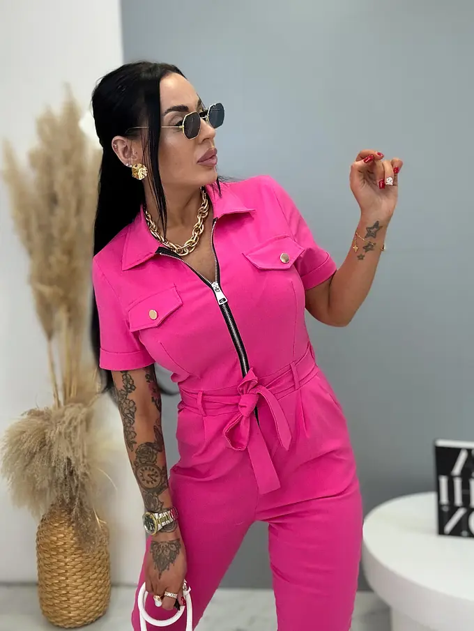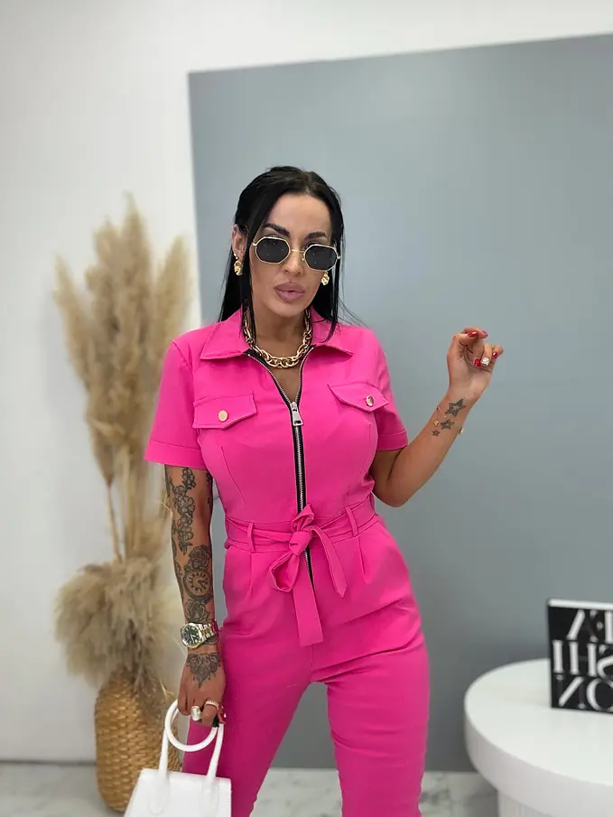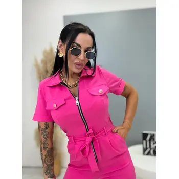 A rövid ujjú, galléros overál stílusos és praktikus darab minden ruhatárba. Extra elasztikus anyagból készült, így maximális kényelmet és szabad mozgást biztosít. Cipzáras kialakítása megkönnyíti az öltözködést, miközben modern megjelenést kölcsönöz. A modellt öv egészíti ki, amely kiemeli a derekat és előnyös sziluettet formál. oldalsó zsebekkel, ami növeli a praktikumot és a kényelmet. Az overál ideális választás mindennapi viseletre és szabadidős tevékenységekhez is.