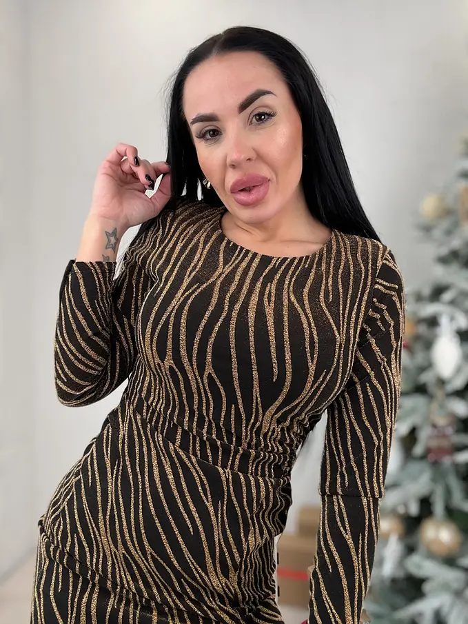 A fekete hajú modell 164 cm magas és 57 kg. XS/S méretű ruhákat visel.