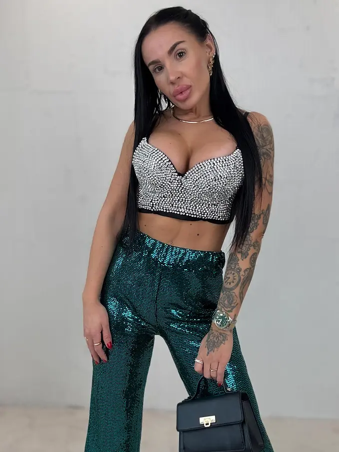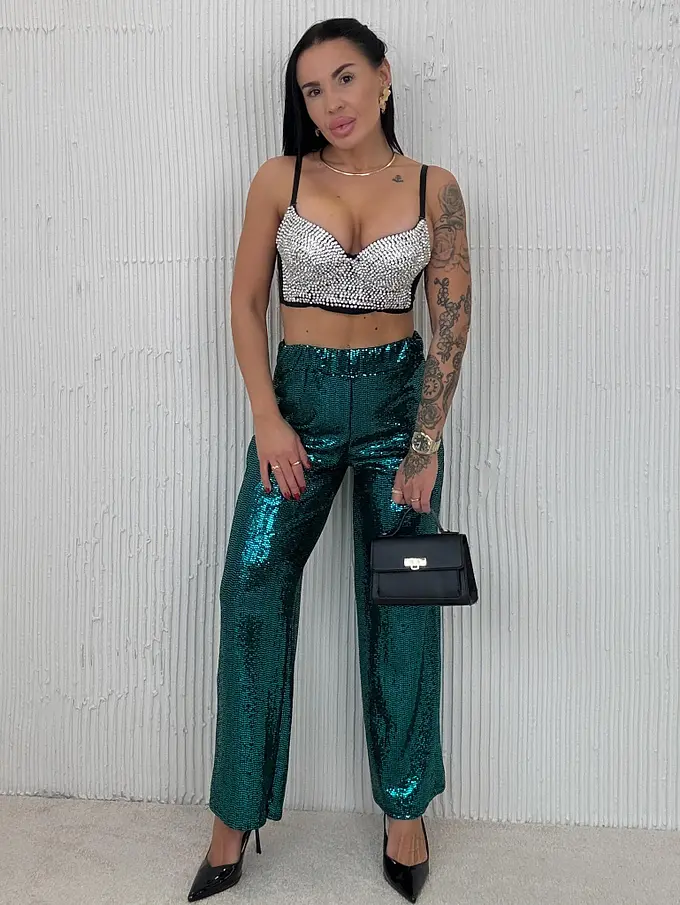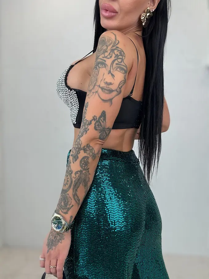 A modell 164 cm magas és 57 kg. S méretű ruhákat visel.