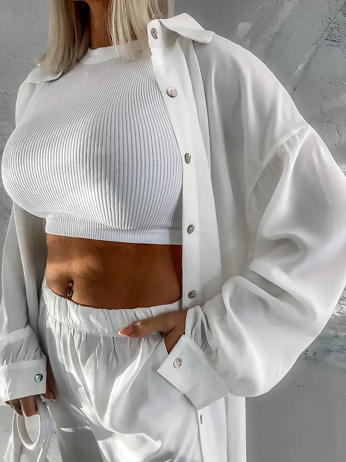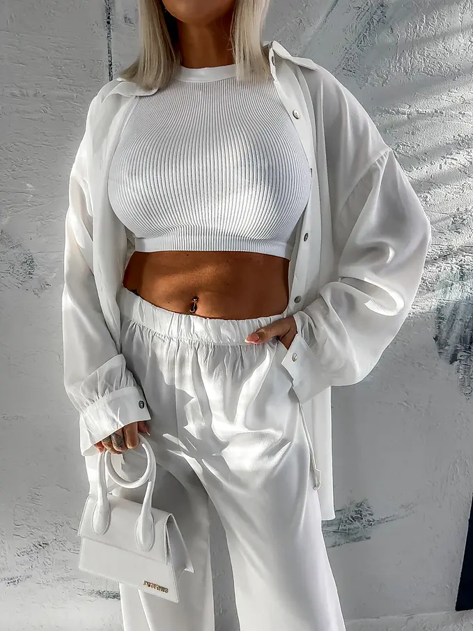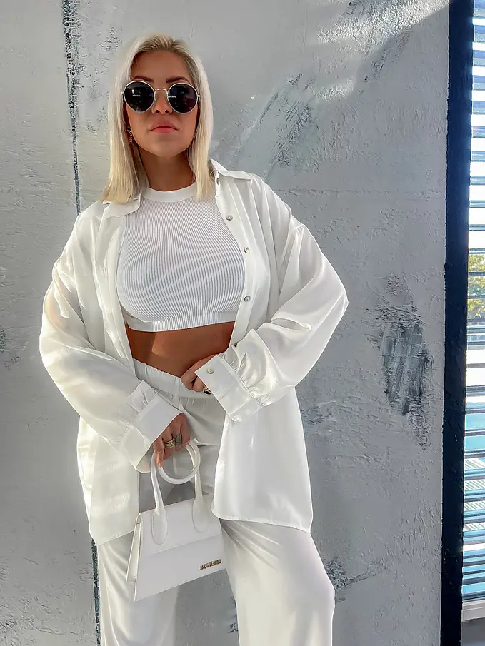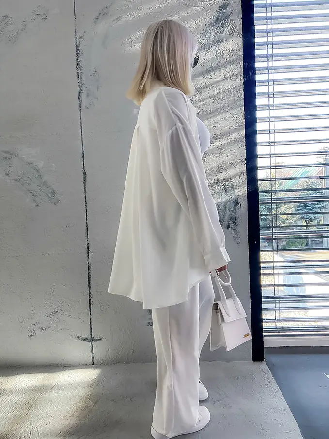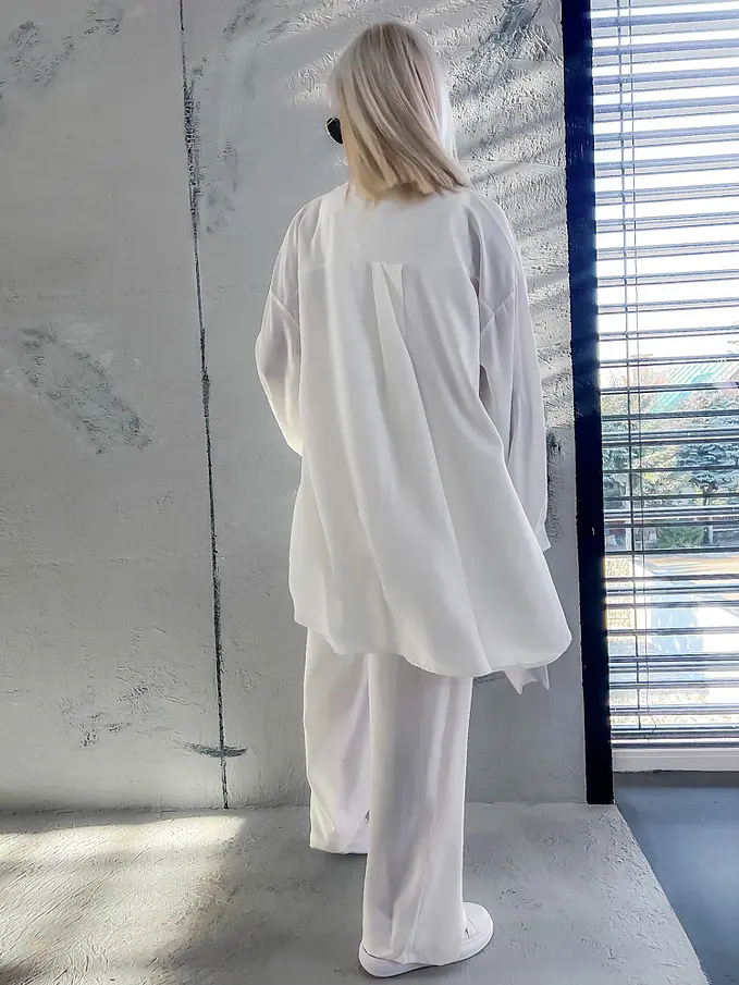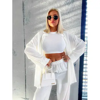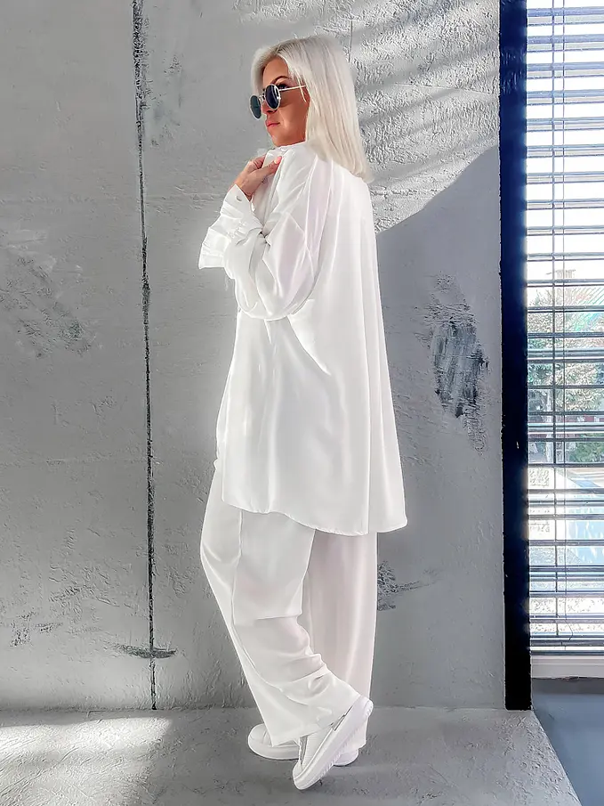 Női elegáns együttes a legújabb kollekcióból. Oversized ingből és wide-leg nadrágból áll. A nadrág dereka gumis.