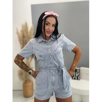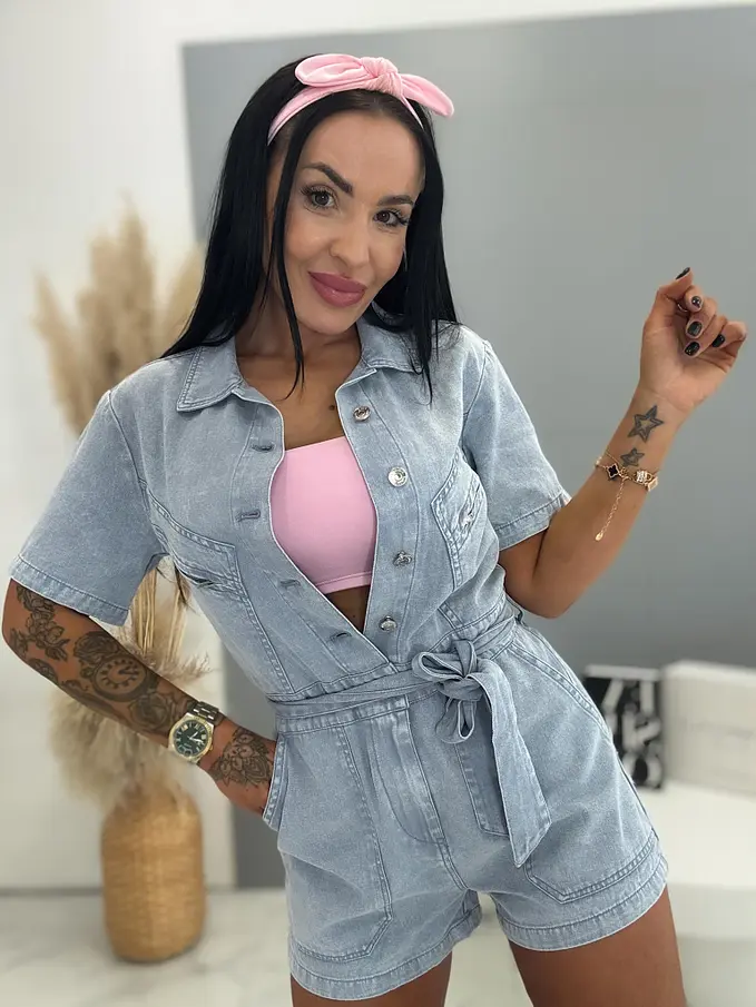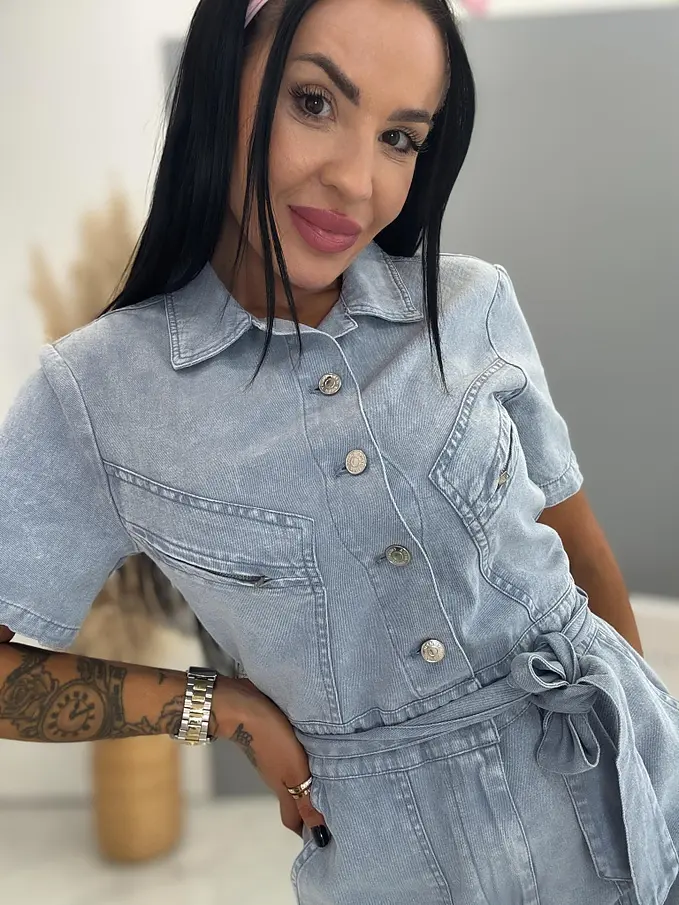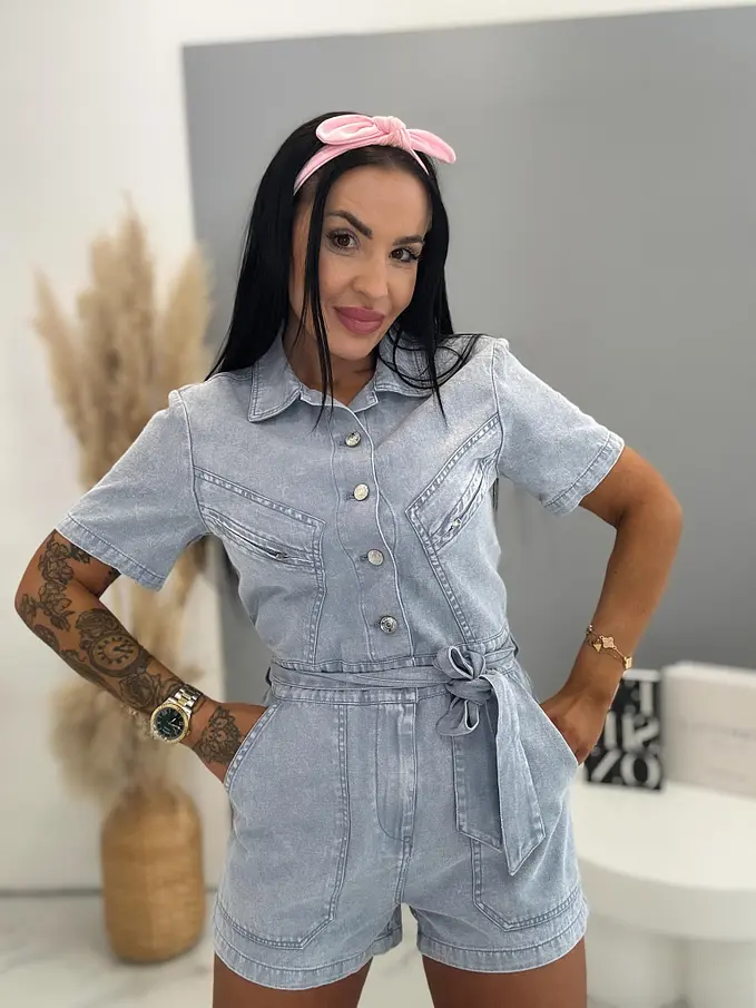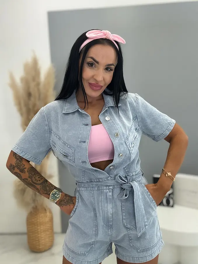 Ez a rövid ujjú, farmer anyagú overál praktikus és stílusos választás a mindennapokra. A derékrészen található öv jobban kiemeli az alakot, nőiesebb sziluettet adva a viselőjének. A mell- és derékrészen elhelyezett zsebek funkcionálisak és divatos részletként is szolgálnak. Az overál gombos záródású, kényelmes viseletet biztosít, és modern, városi megjelenést kölcsönöz.