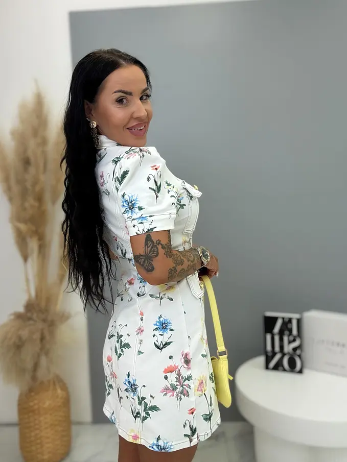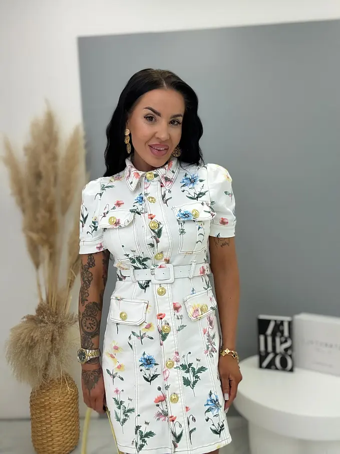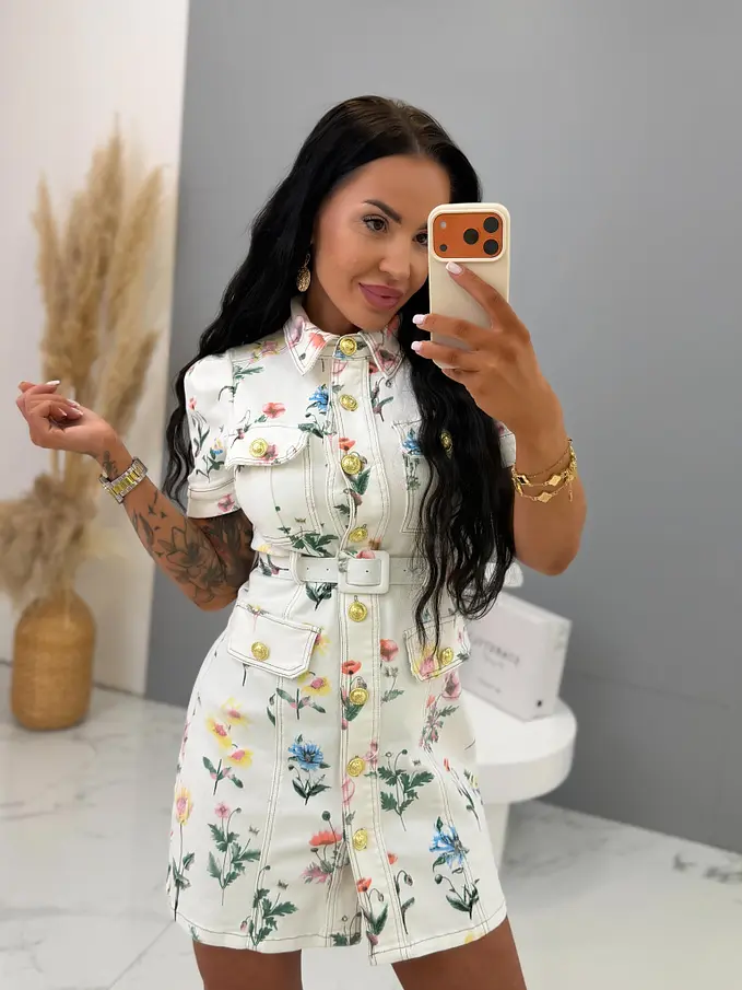 Prémium ruhák közvetlenül Franciaországból. Virágmintás farmerruha arany gombokkal és övvel. Az anyaga enyhén elasztikus.