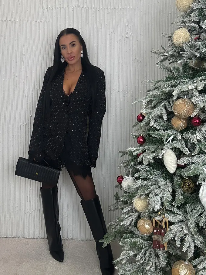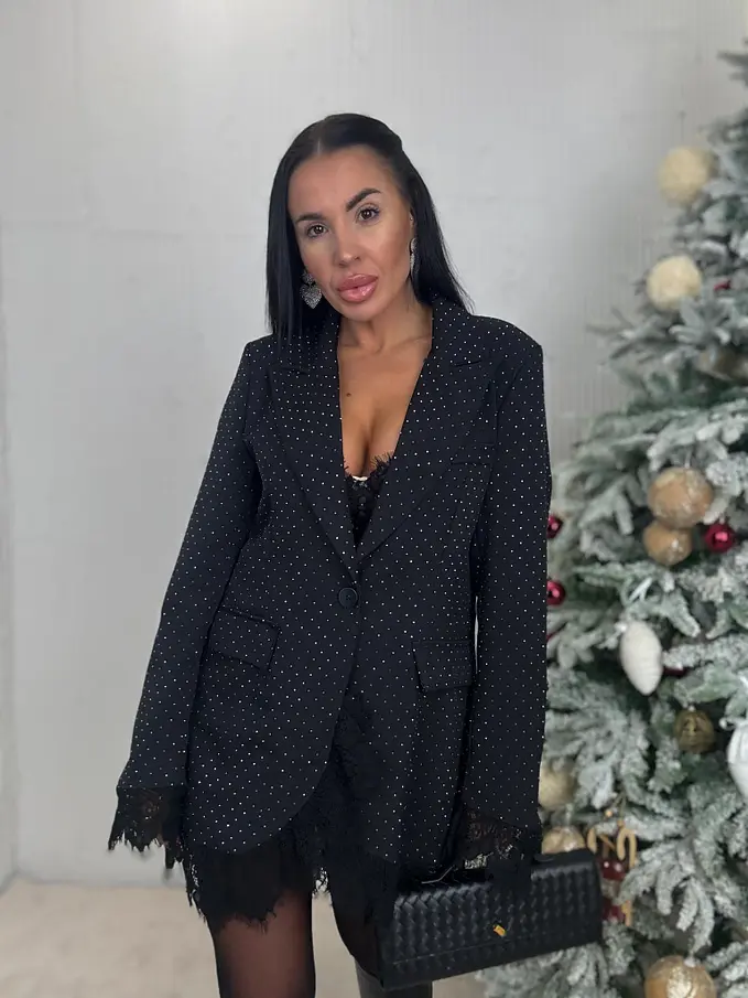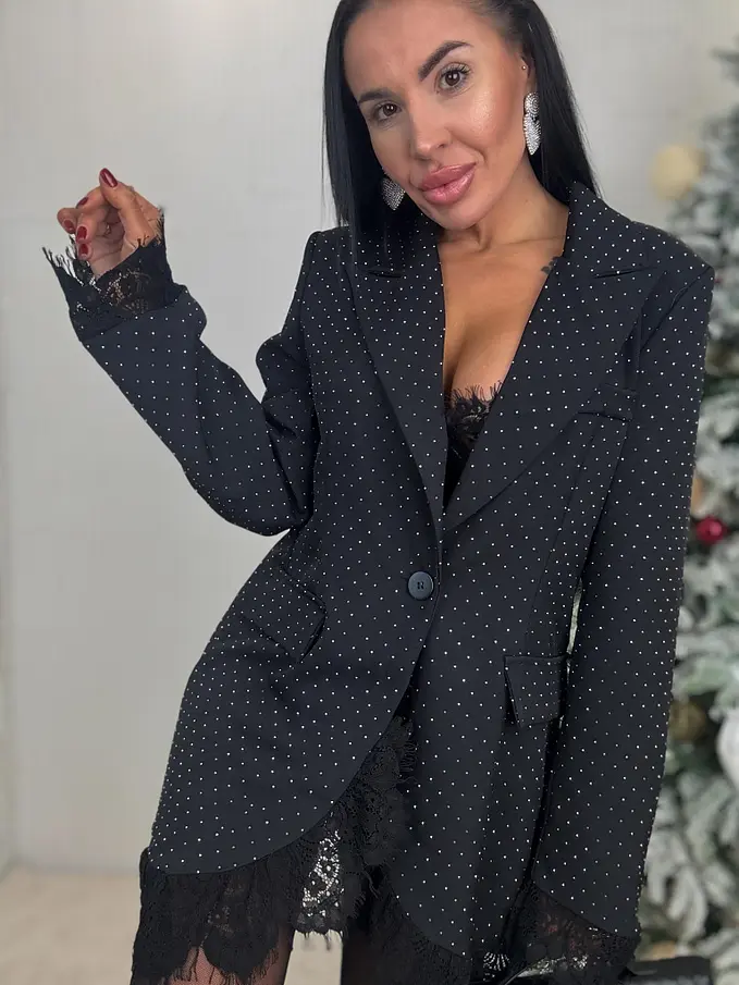 Női blézer kellemes anyagból. Az anyag nem rugalmas. A blézer gombbal záródik. Vállrésznél válltöméssel rendelkezik. Átlátszó csipkebetétekkel és kövecskékkel díszítve.