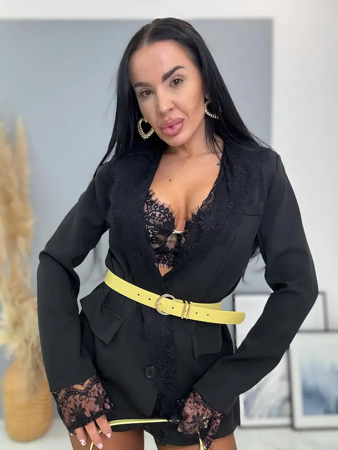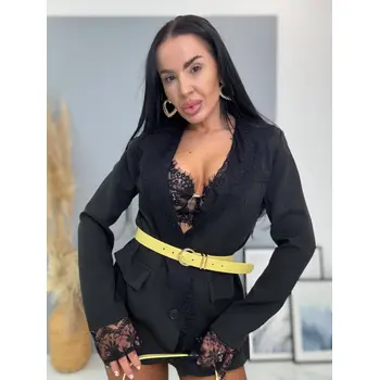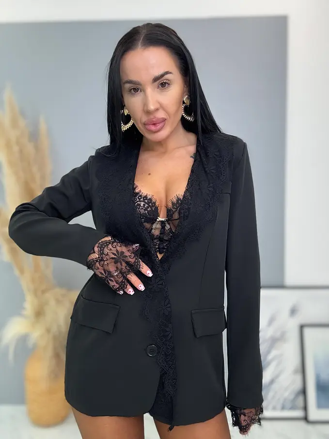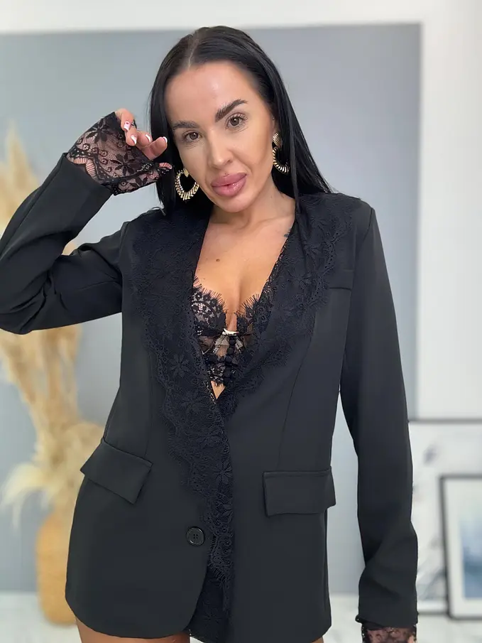 Női blézer kellemes anyagból. Az anyag nem rugalmas. A blézer gombokkal záródik. Vállrésznél válltöméssel rendelkezik. Átlátszó csipkebetétekkel.