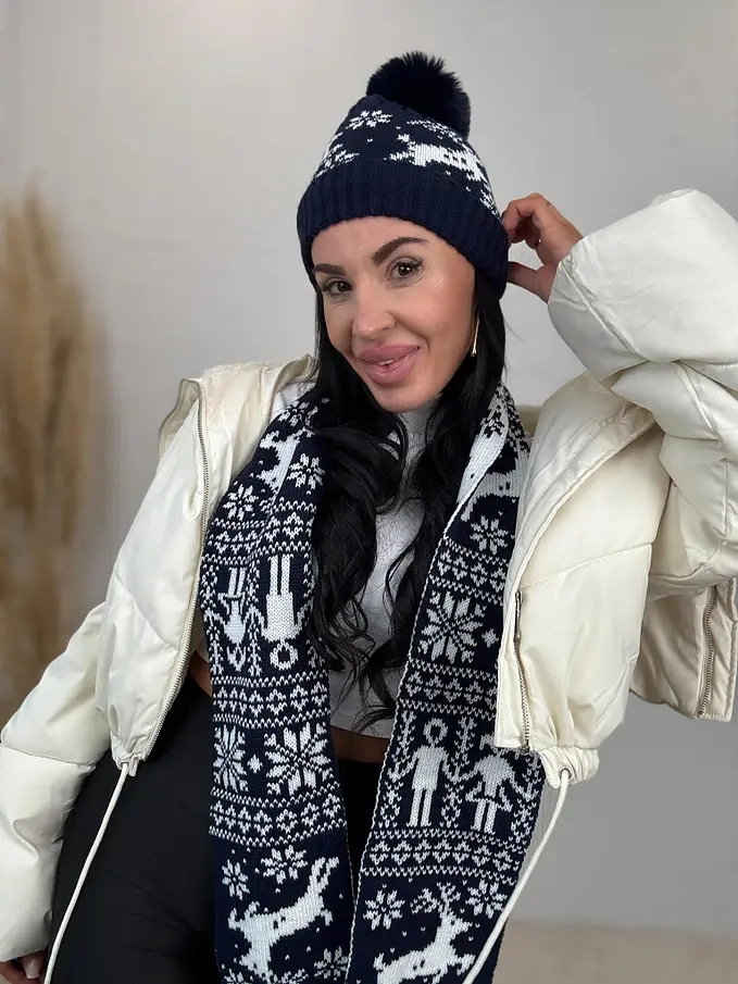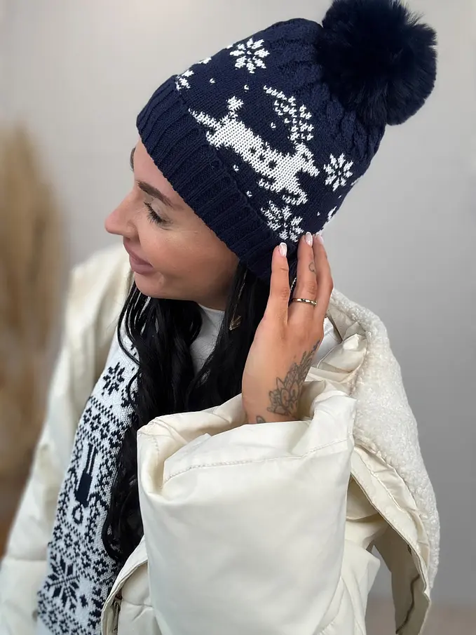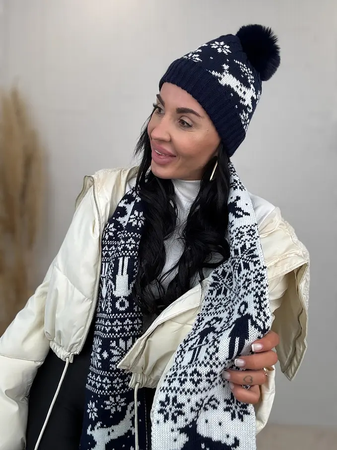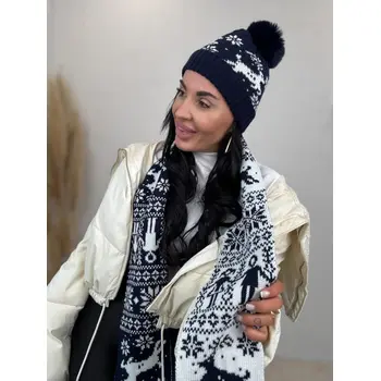 Klasszikus meleg női téli sapka gombóccal és sállal.