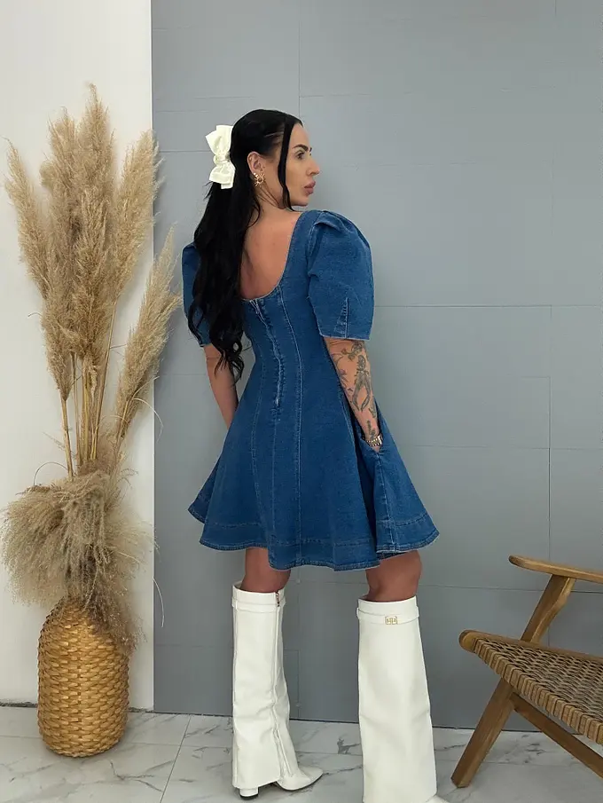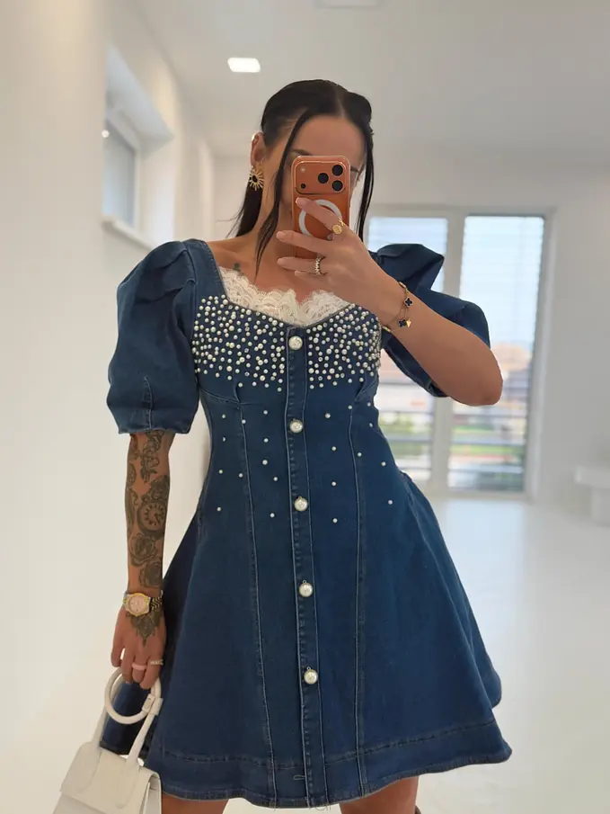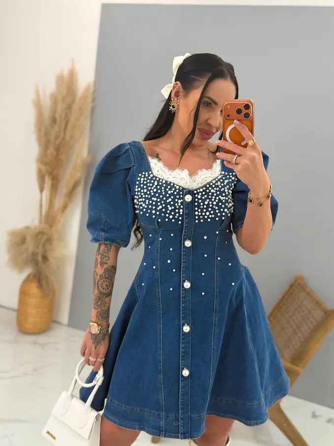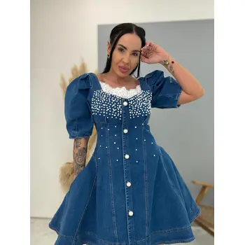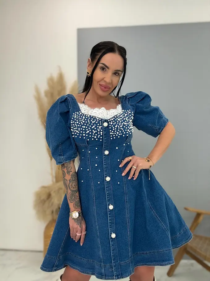 Prémium ruhák közvetlenül Franciaországból. Farmerruha gyöngyös gombokkal. Az anyaga elasztikus. Hátul cipzárral és oldalsó zsebekkel.
