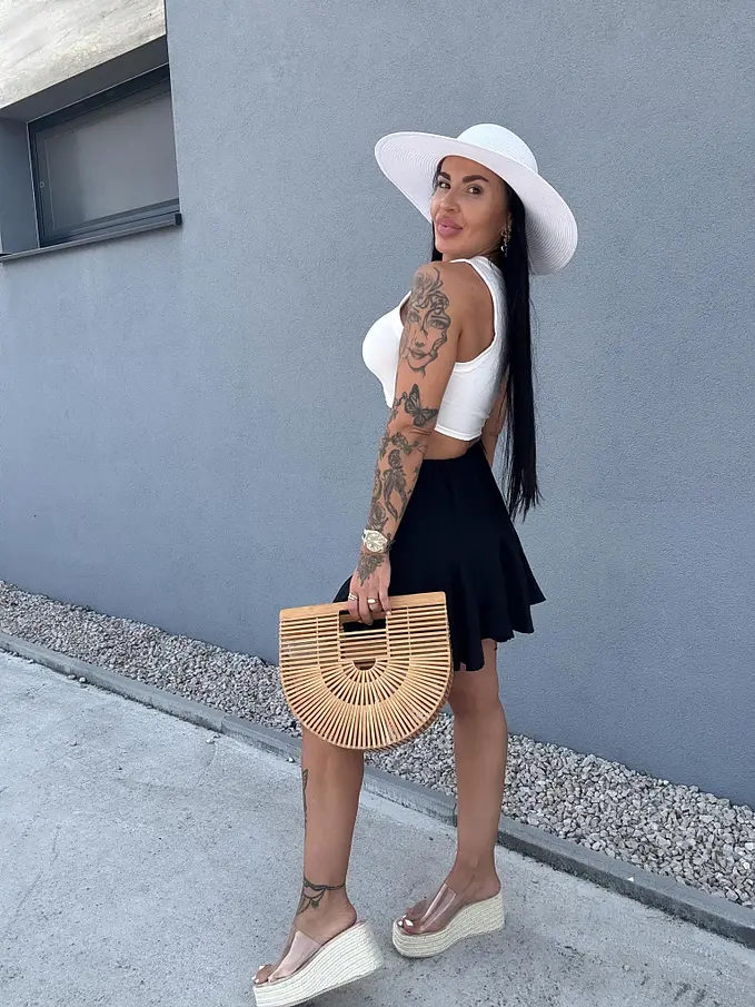 A fekete hajú modell 164 cm magas és 64 kg. M/L méretű ruhákat visel. Méretek: 99 cm - 74 cm - 93 cm.